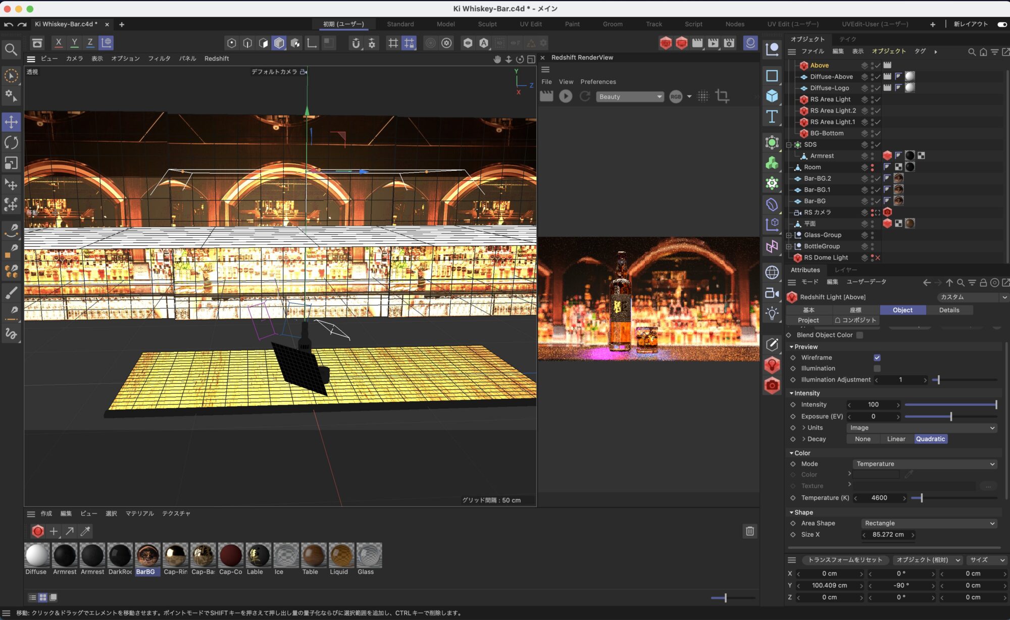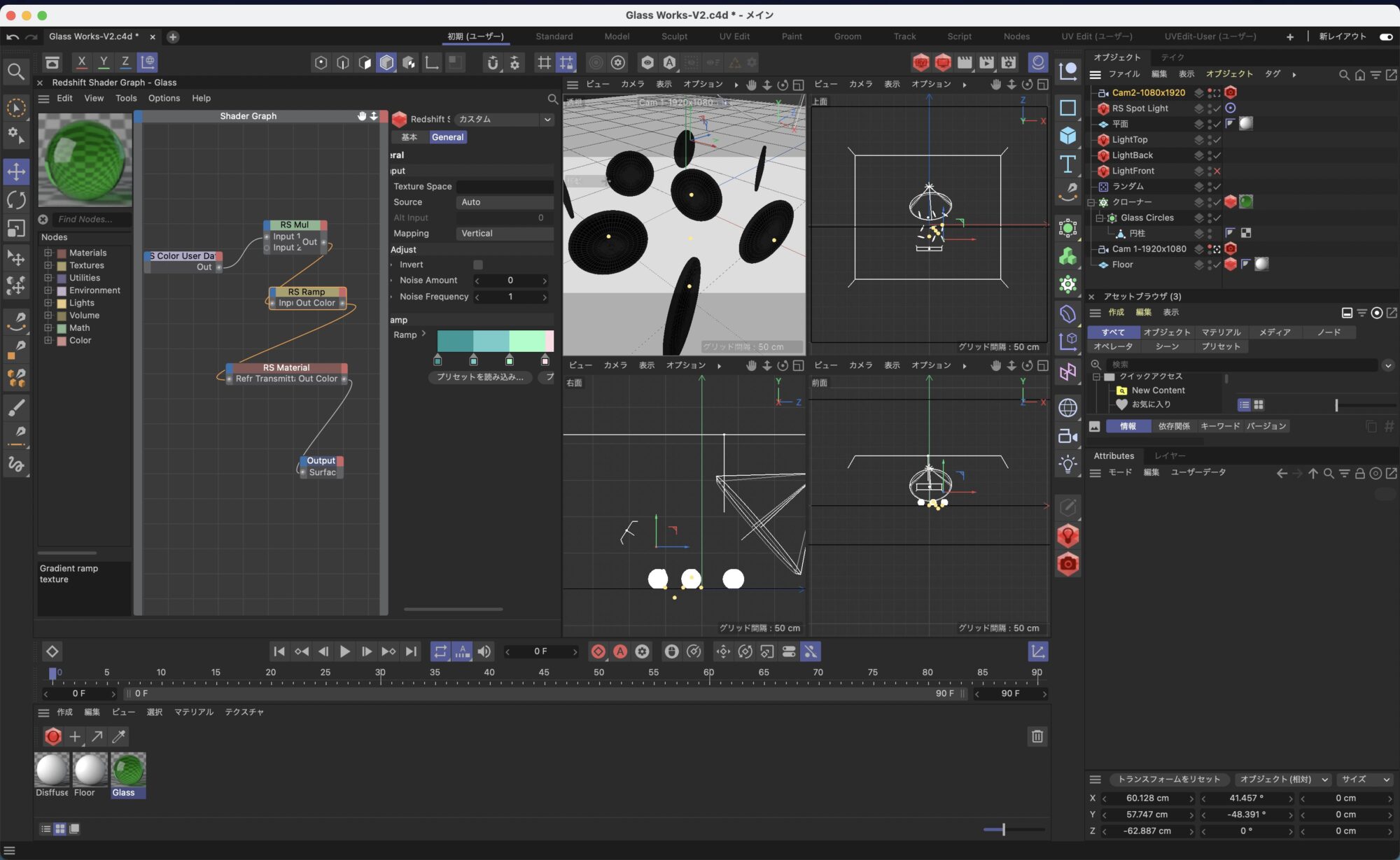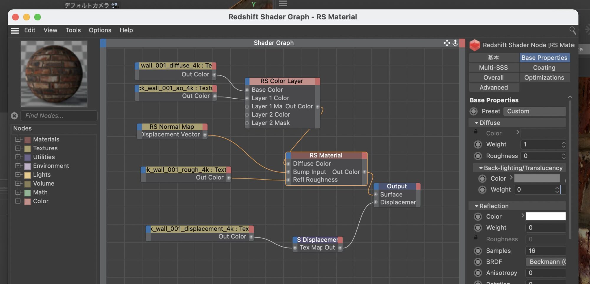 この辺りでRedshiftでのライトやカメラオブジェクト、シェーダーノードの使い方が理解できるようになりました。