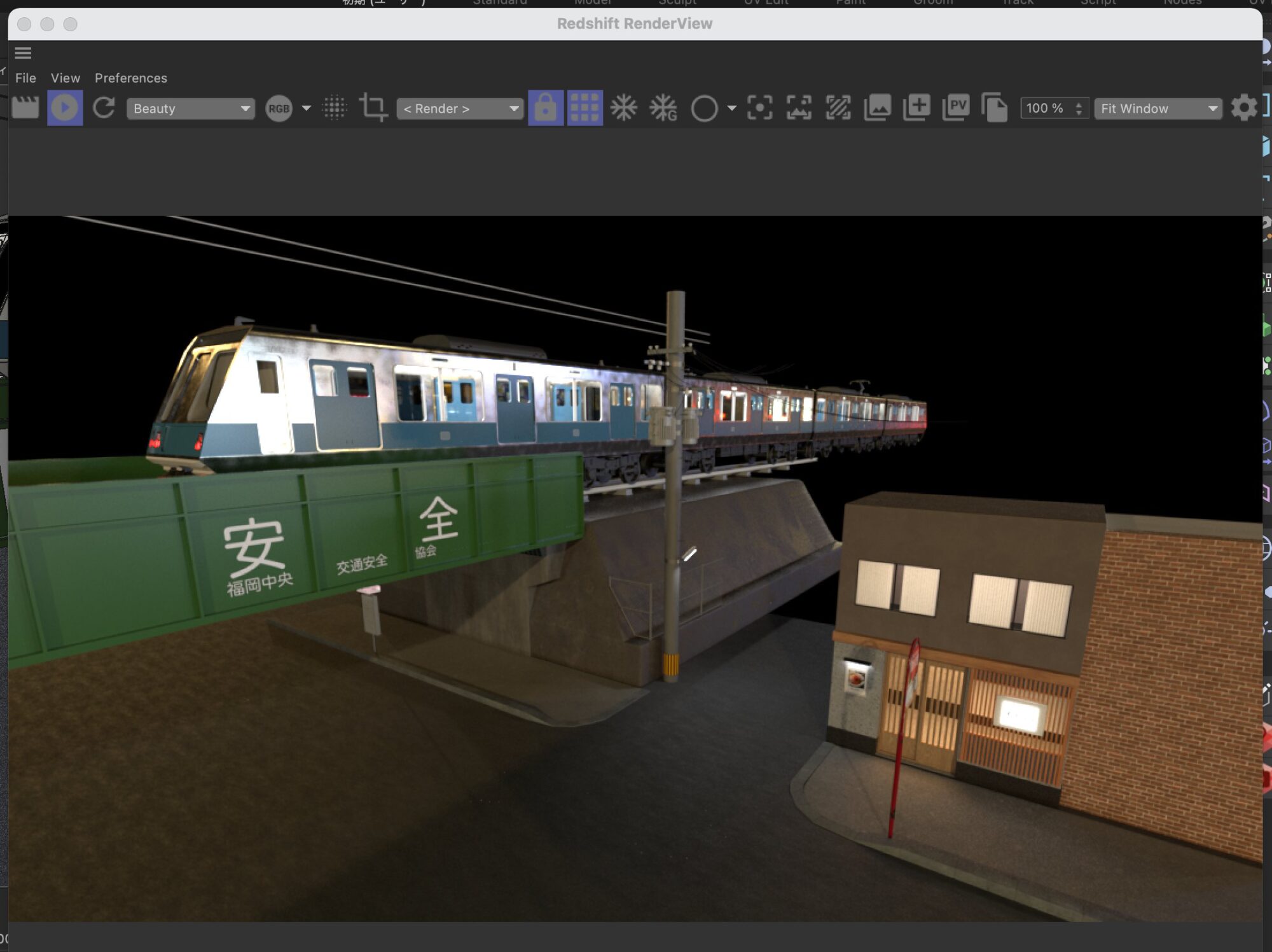 下は1年目に作成した電車のオブジェクトにマテリアルを追加し、今回新しく作成した居酒屋の外観を組み合わせました。