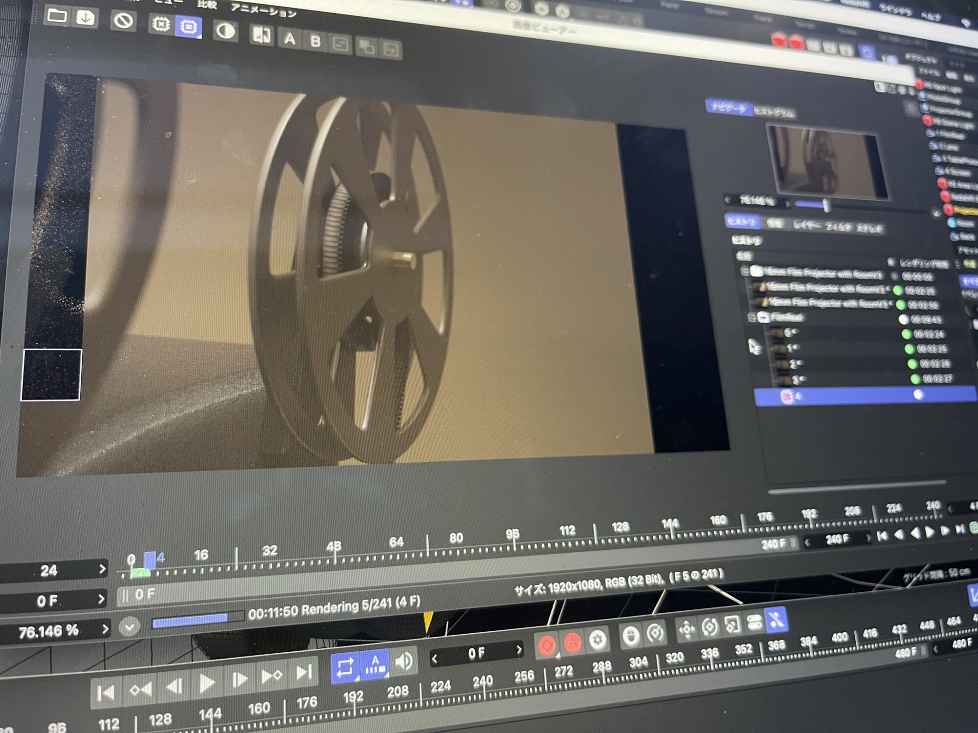 フィルム映写機のモデリングではおおよそ5日間かかり、たった数秒書き出すのにレンダリングが24時間かかるなど、実写合成で必要なワークフローなどを学ぶことが出来ました。