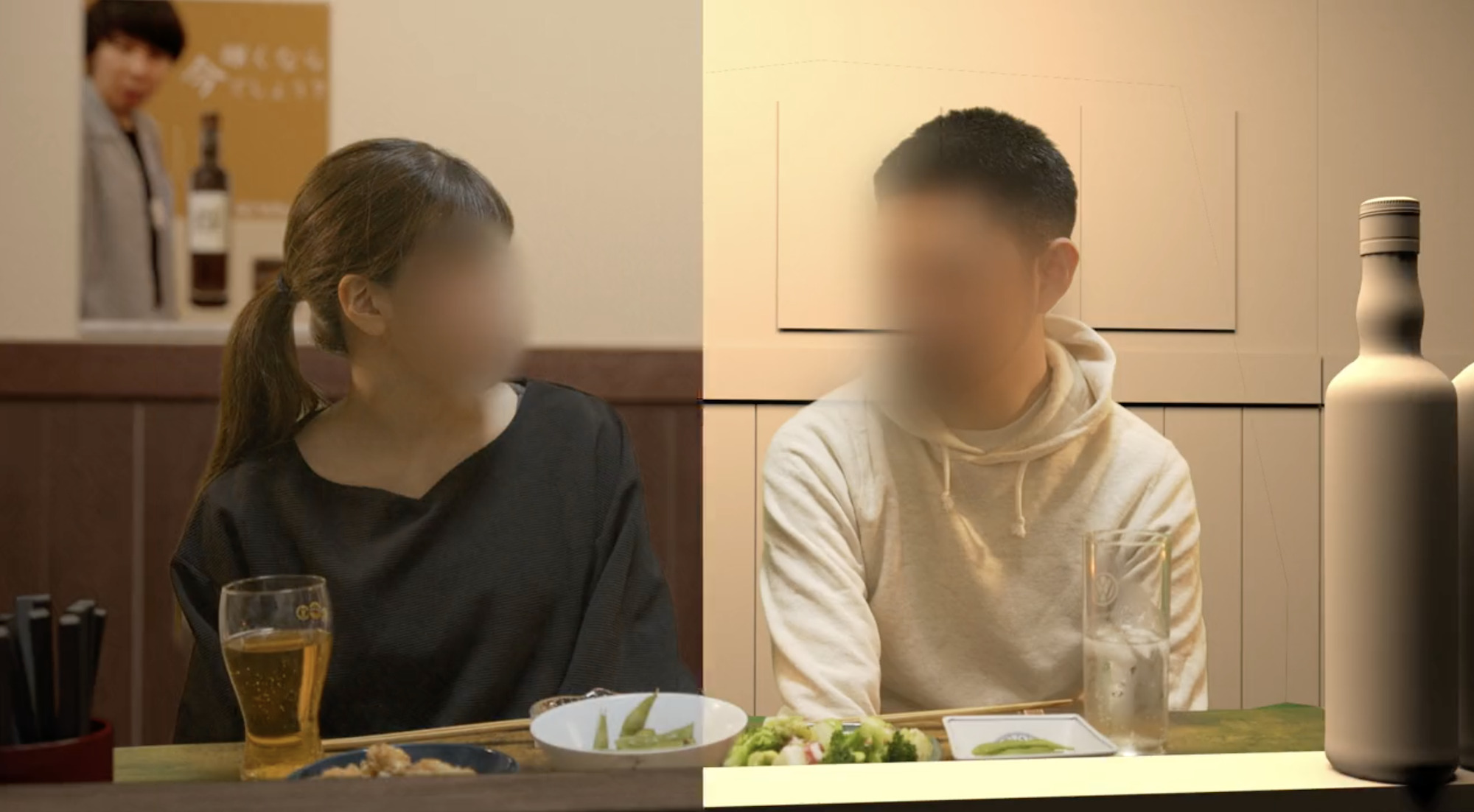 そして居酒屋のシーンでは下のように、グリーンスクリーン背景に撮影したものをCinema 4Dで作成したオブジェクトを組み合わせ、After Effectsでコンポジットしています。