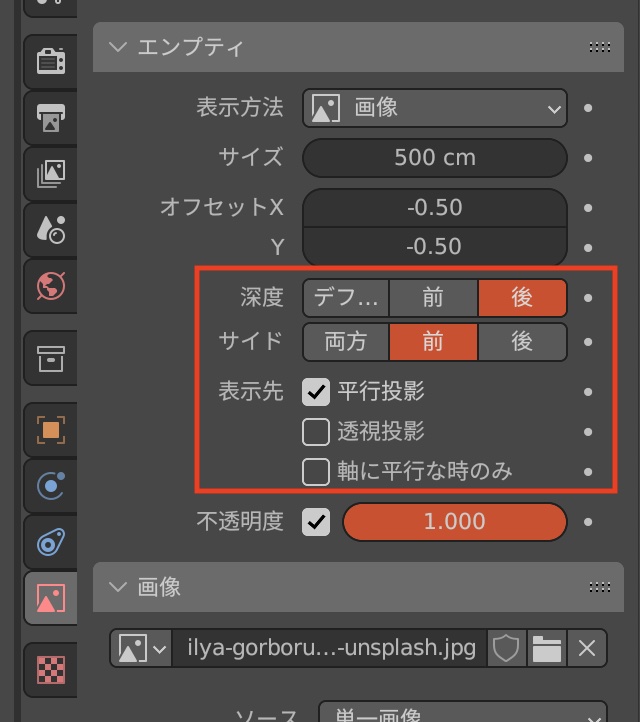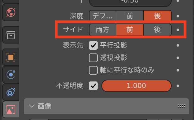 オブジェクトデータプロパティでは画像の大きさや位置を設定する「サイズ」、「オフセットXY」に加えて、「深度」、「サイド」、「表示先」のオプションが用意されています。