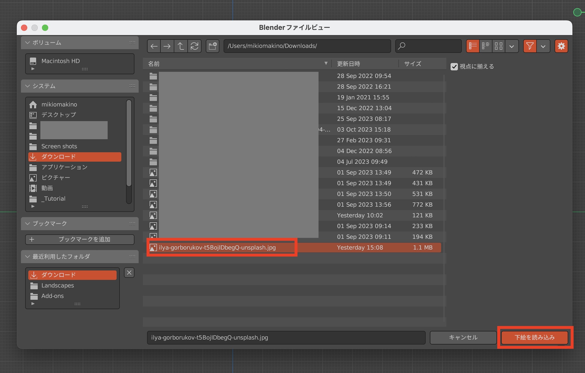 するとファイルブラウザが開くので、背景として設定する画像を選択し、「下絵を読み込む」をクリックします。今回はUnsplashで入手したワイングラスを背景画像として設定してみます。