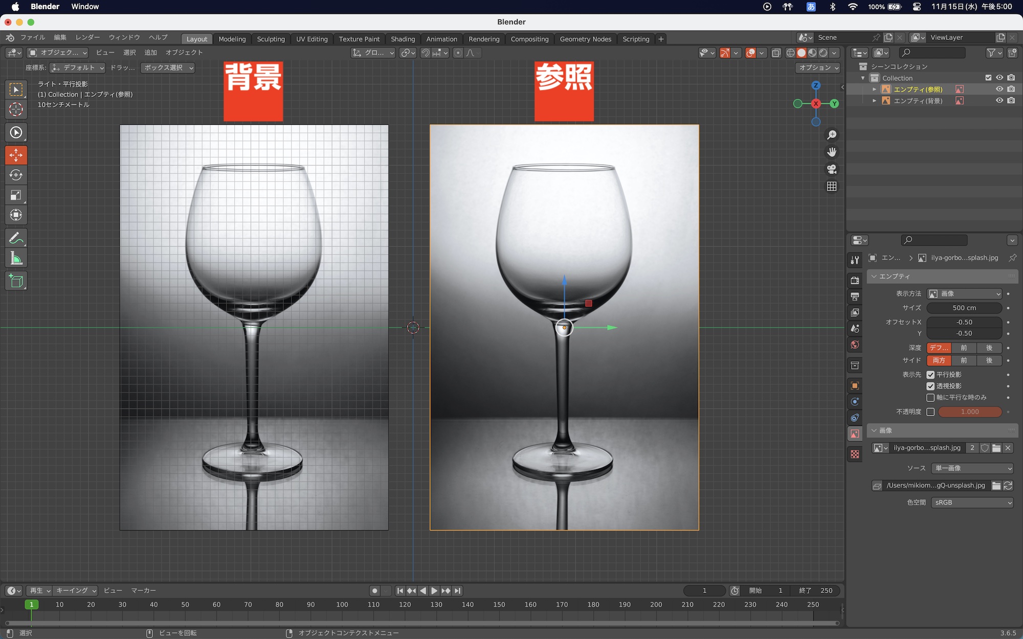Cinema 4Dなどではシーン設定から行えたりしますが、Blenderの場合は「背景(Background)」または「参照(Reference)」という画像オブジェクトにして読み込むことで、下絵(背景)として設定することができます。