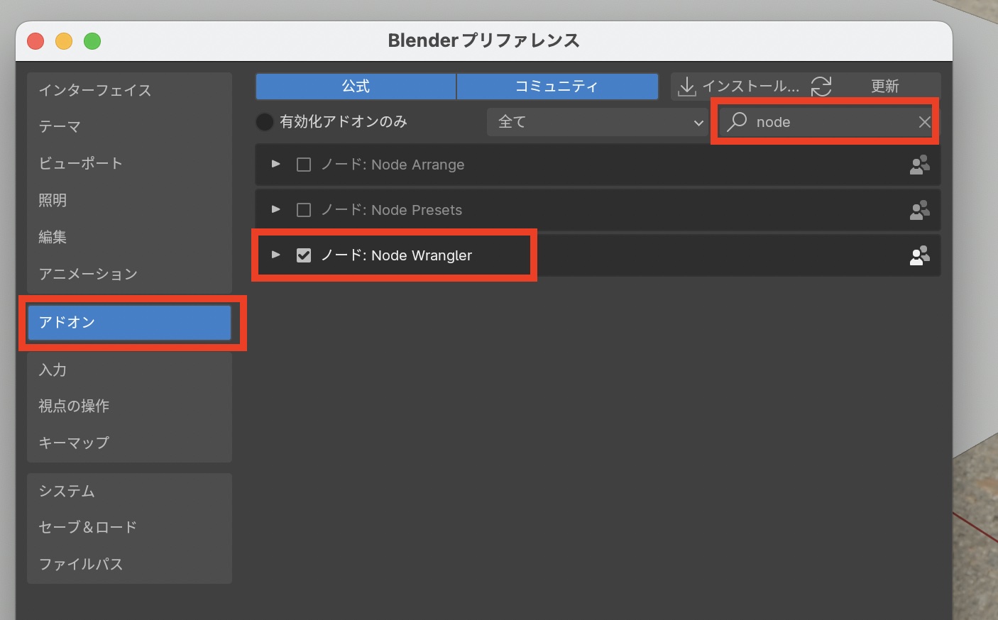 Blenderインストール時にプリインストールされているアドオンなので、Blenderのプリファレンスの「アドオン」の検索窓から「Node」と入力し、「Node Wrangler」にチェックを入れ、有効化します。