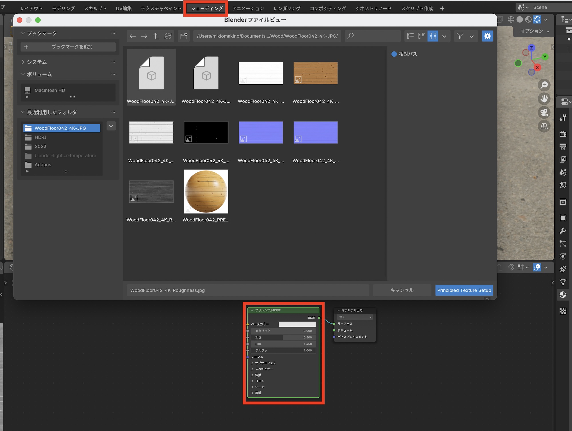 「シェーディング」のワークスペースに切り替え、シェーダーエディターにてPBRテクスチャを反映させるプリンシプルBSDFを選択し、「Control + Shift + T」でファイルブラウザを開きます。