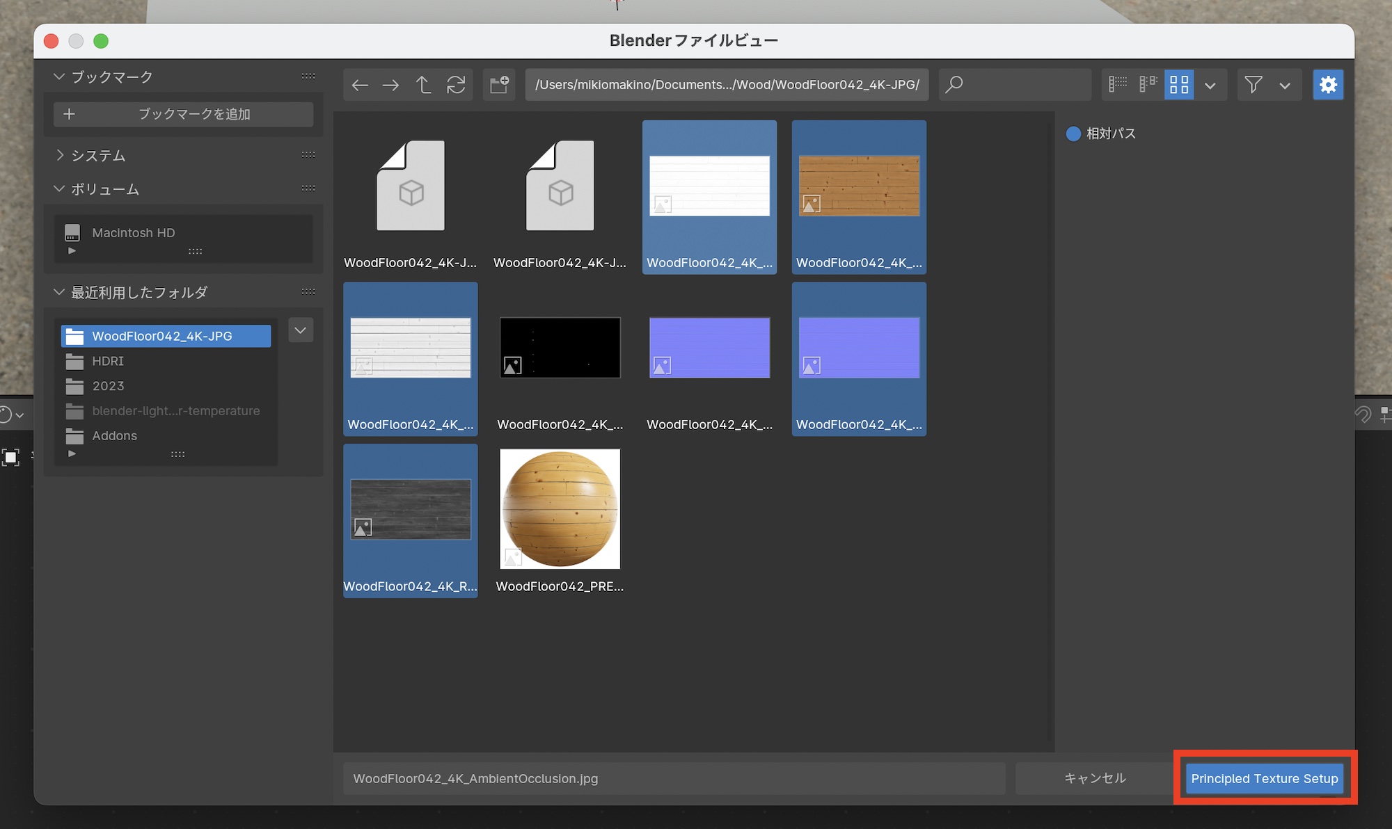 カラーやノーマルなどのマップを選択し、「Principled Texture Setup」をクリックして読み込むと、自動でノードが追加と接続され一瞬でPBRテクスチャを反映できるようになります。