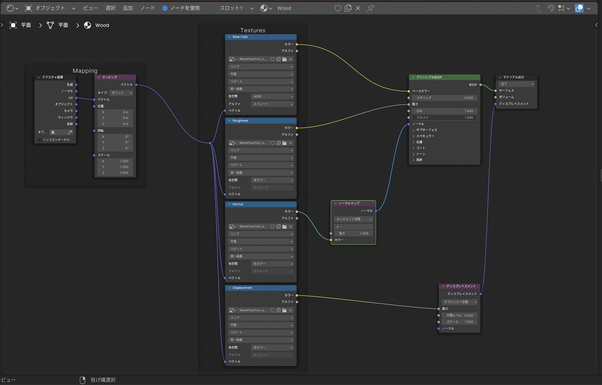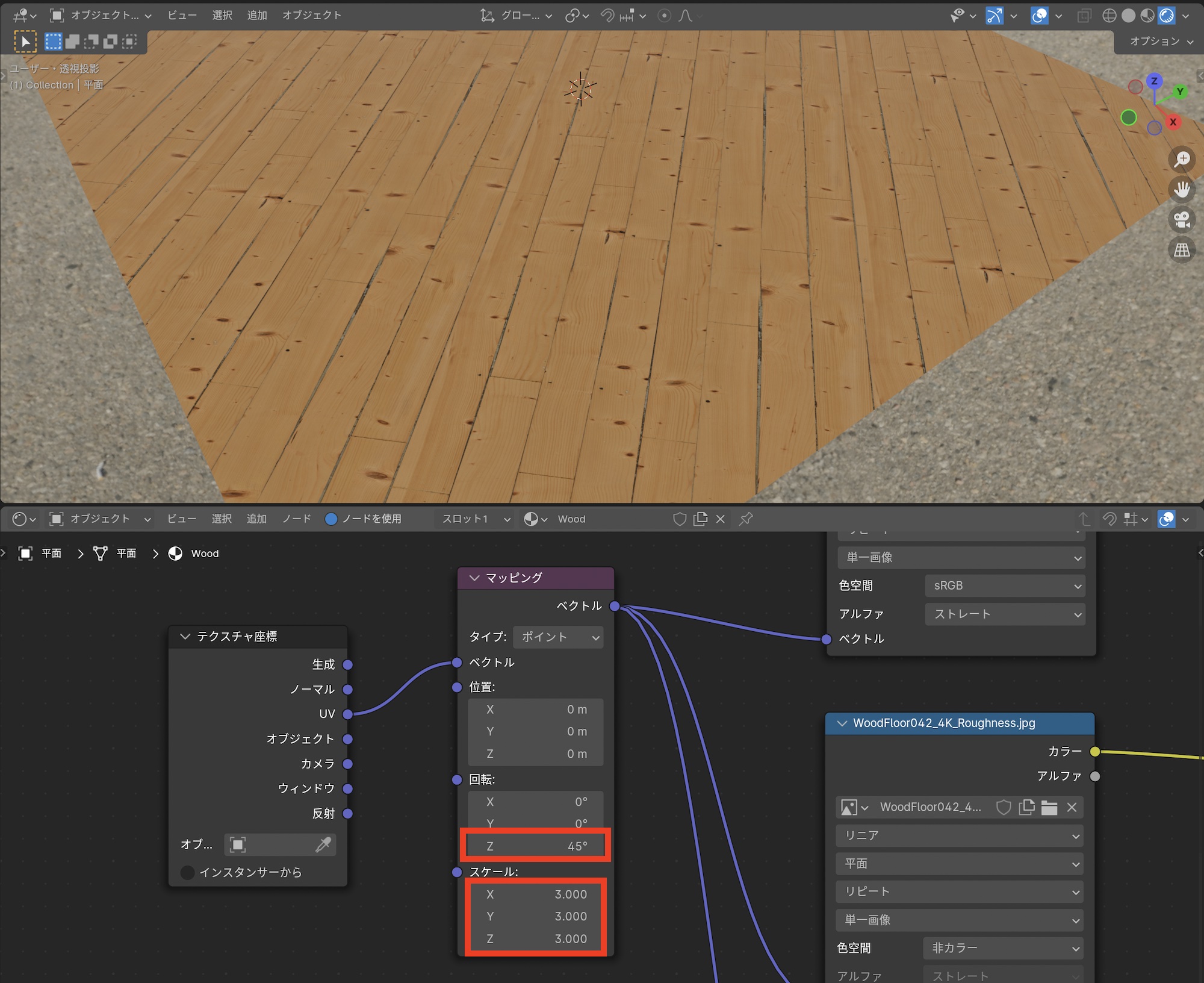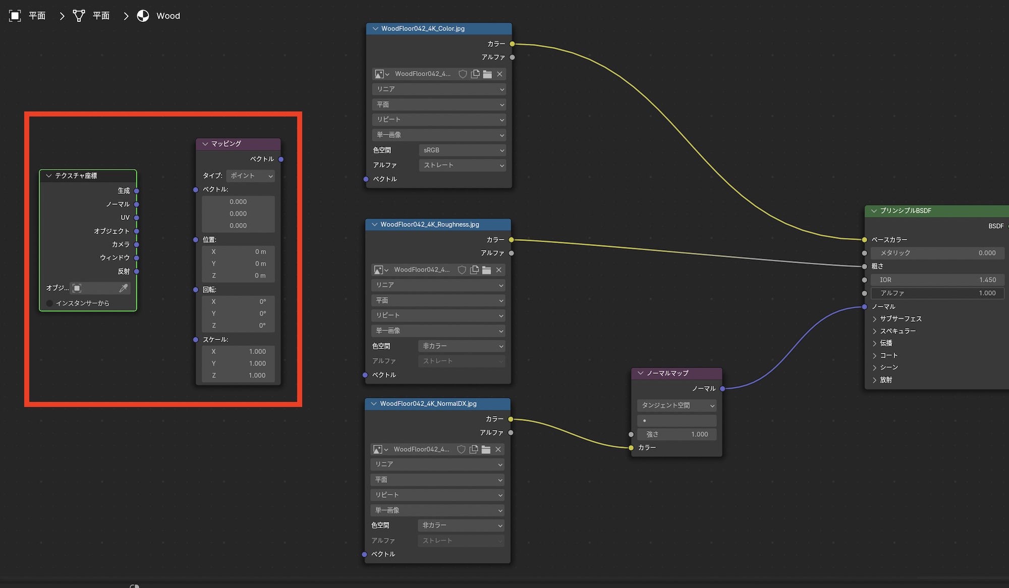 これでカラー、ラフネスとノーマルマップをマテリアルに接続することでPBRテクスチャを反映できたのですが、平面のサイズに比べてテクスチャが大きすぎるので、ノードを更に追加して、テクスチャの座標を変更できるようにします。