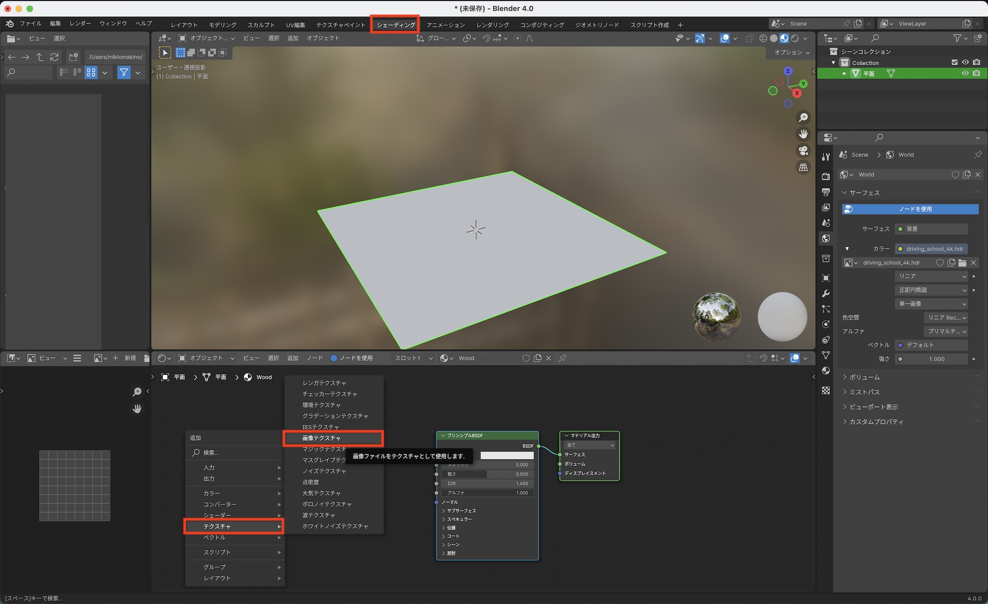 上部の「シェーダー(Shader)」のタブをクリックし、ワークスペースを切り替え、シェーダーエディタで「Shift + A」または「追加」「テクスチャ」の中にある「画像テクスチャ」のノードを追加します。