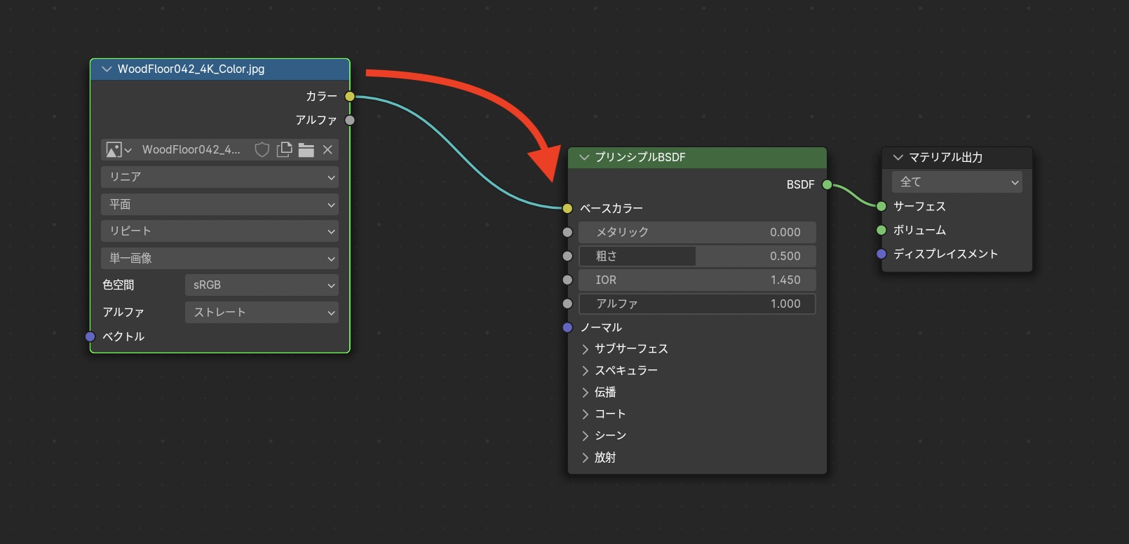 画像テクスチャノードに反映するPBRテクスチャのカラー(ディフューズ)の画像を読み込み、プリンシプルBSDFの「ベースカラー」に接続します。