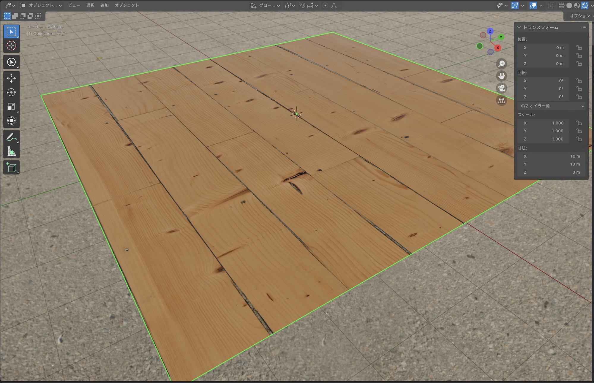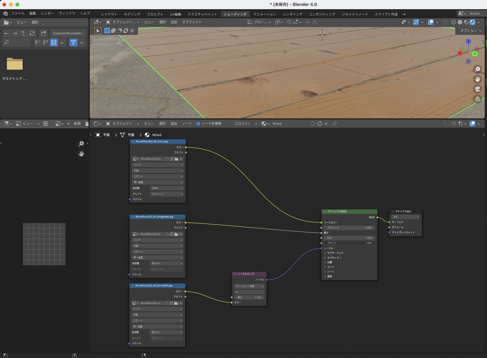 オブジェクトモードで追加した平面に木のタイルのPBRテクスチャを追加していきます。平面を選択した後で、プロパティの「マテリアル」の項目からマテリアルを追加し、「プリンシプルBSDF」を適用します。わかりやすいようにマテリアル名を「Wood」にします。