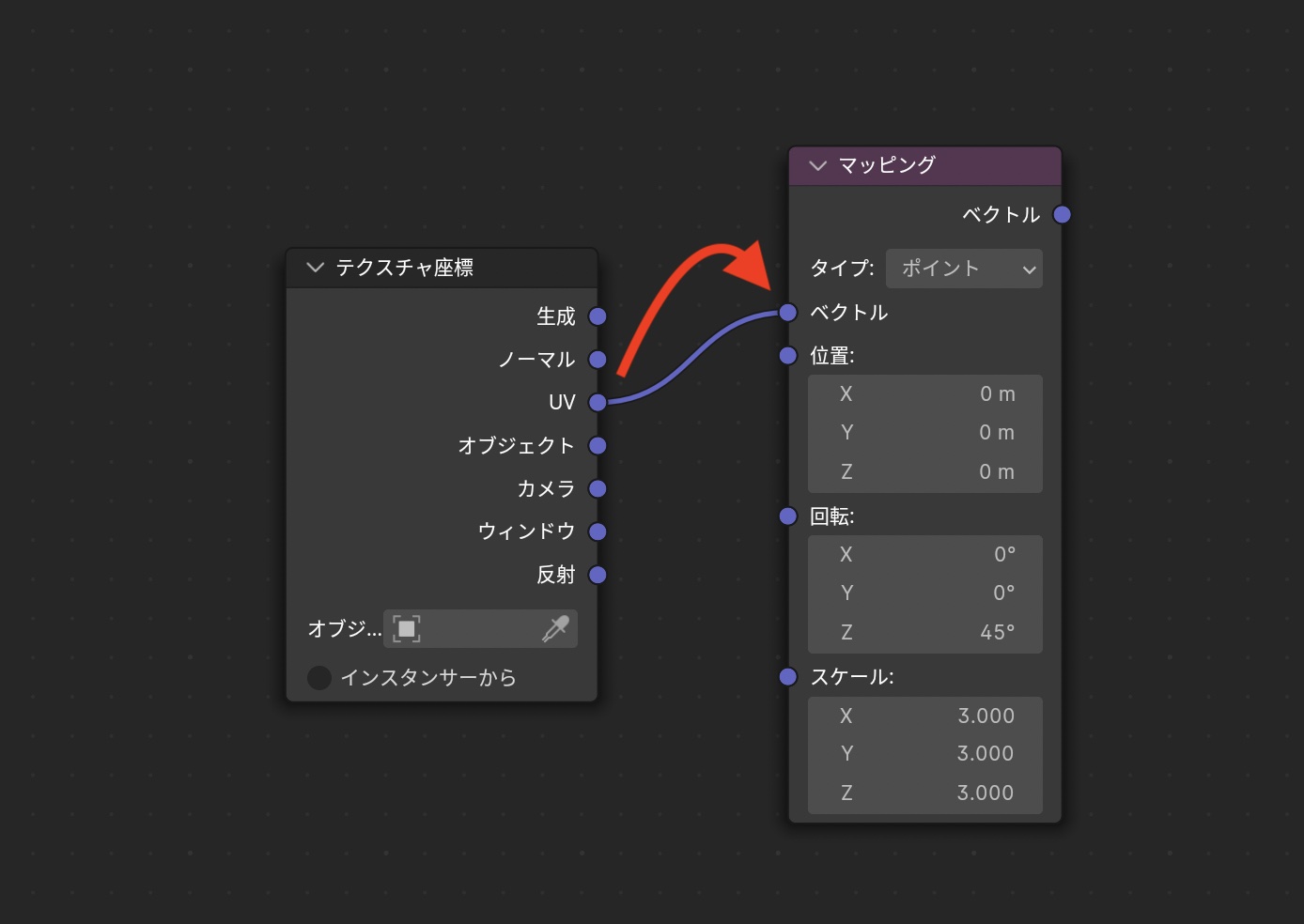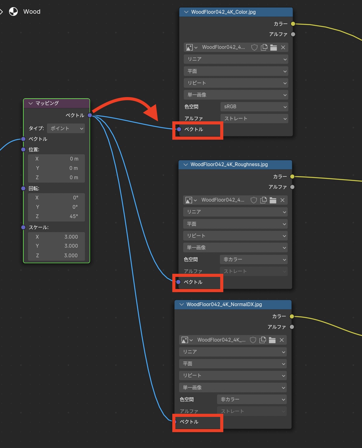 「テクスチャ座標」の「UV」を「マッピング」の「ベクトル」に接続し、「マッピング」の右側にある「ベクトル」を各マップの「ベクトル」に接続します。