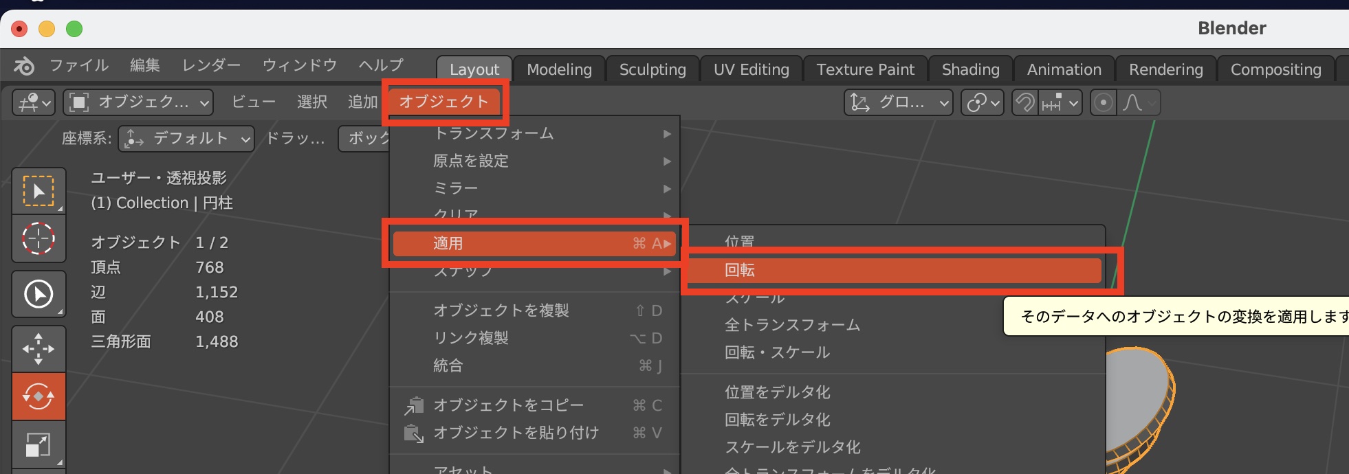 一般的な流れとしては最終的に作成するメッシュのベースとなる、立方体といったオブジェクトを追加したあとで、編集モードでモデリングし、メッシュが完成したらオブジェクトモードに移って移動や回転などの操作を行うのですが、Blenderの場合はモデリングを失敗しないために一度「適用(Apply)」を行うことをおすすめします。