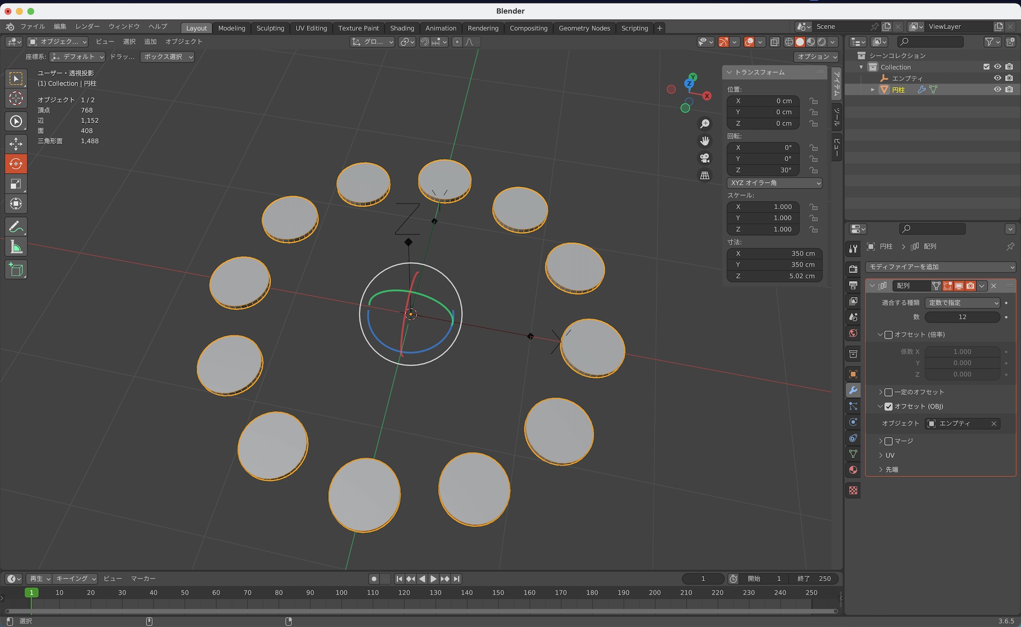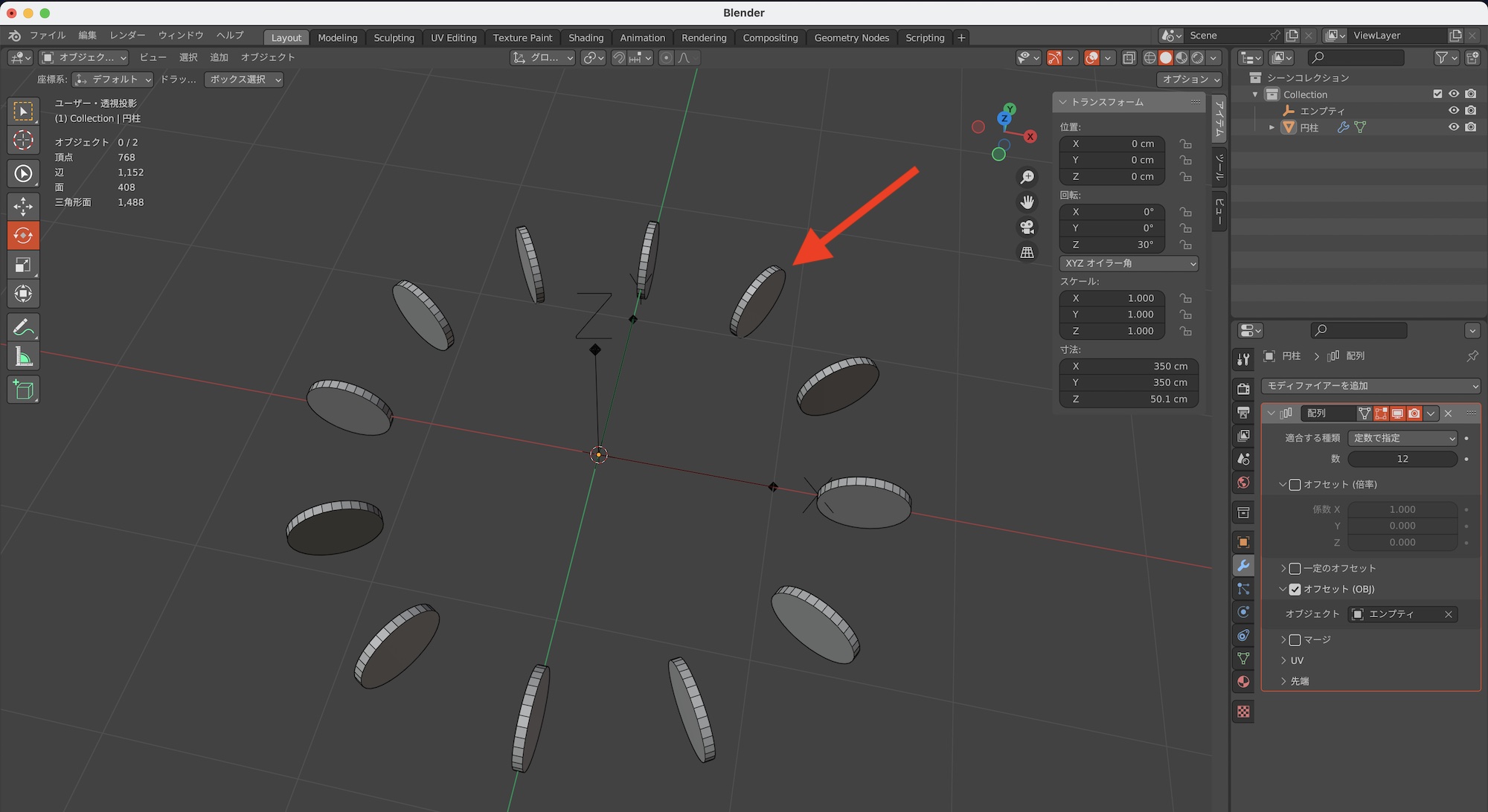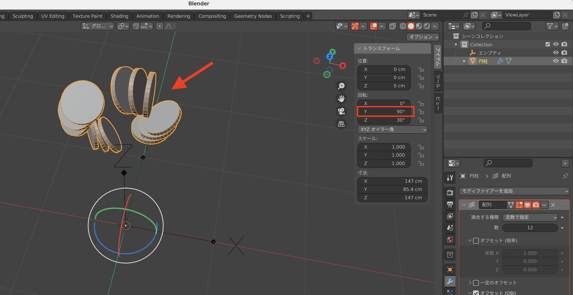 配列している円柱の角度を変えるため、オブジェクトモードでベースの円柱を選択し、「回転:Y」を「90°」にしてみると、回転はしたものの配列が変な方向になってしまいました。