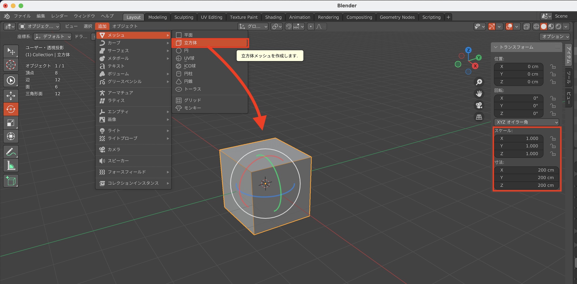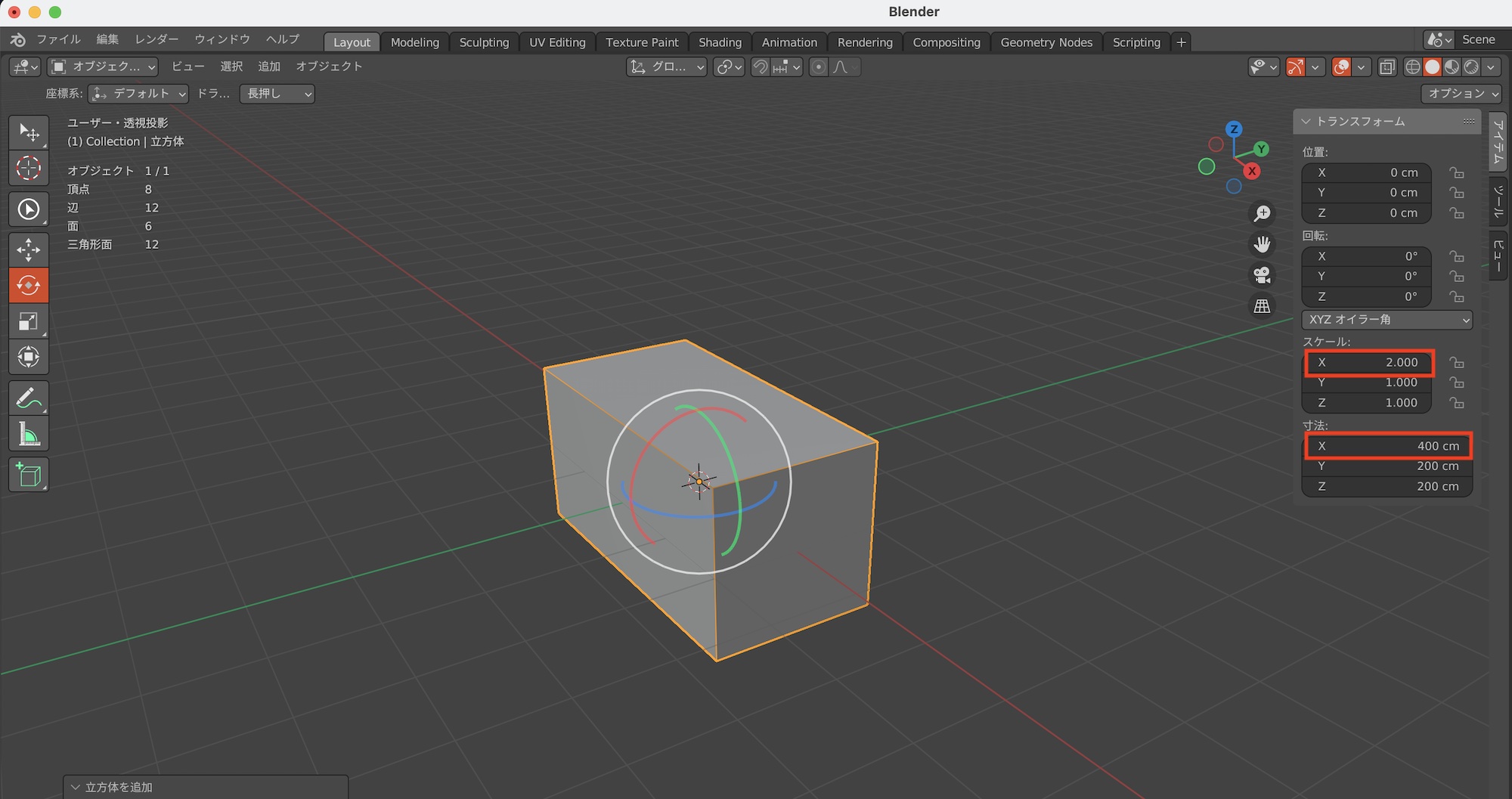 立方体を例にしてみましょう。Blenderで立方体を追加すると、デフォルトのサイズ(寸法)は「2m」となっており、スケールも2mを「1.000(100%)」としています。