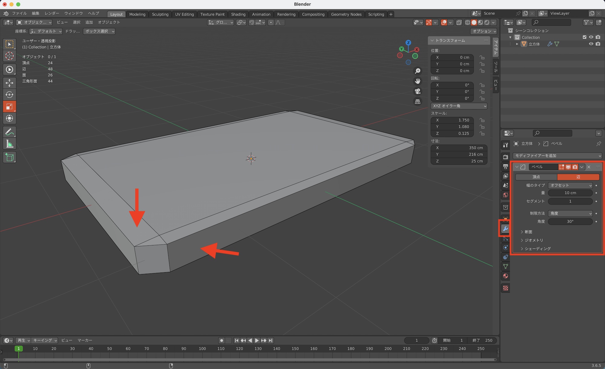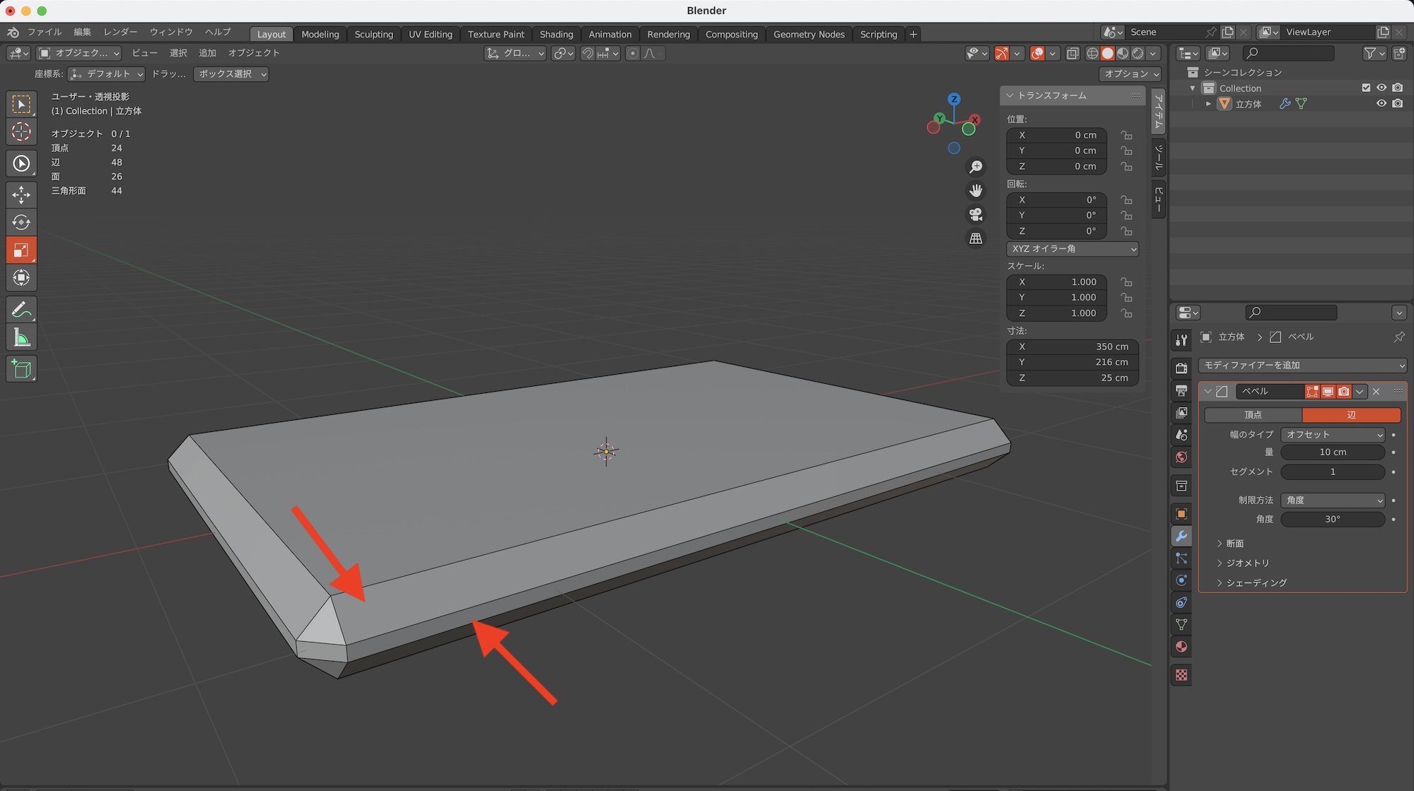 そこで、立方体に「適用: スケール」を反映すると、オブジェクトのXYZ軸のスケールが100%になり、ベベルの効果が正しくなりました。