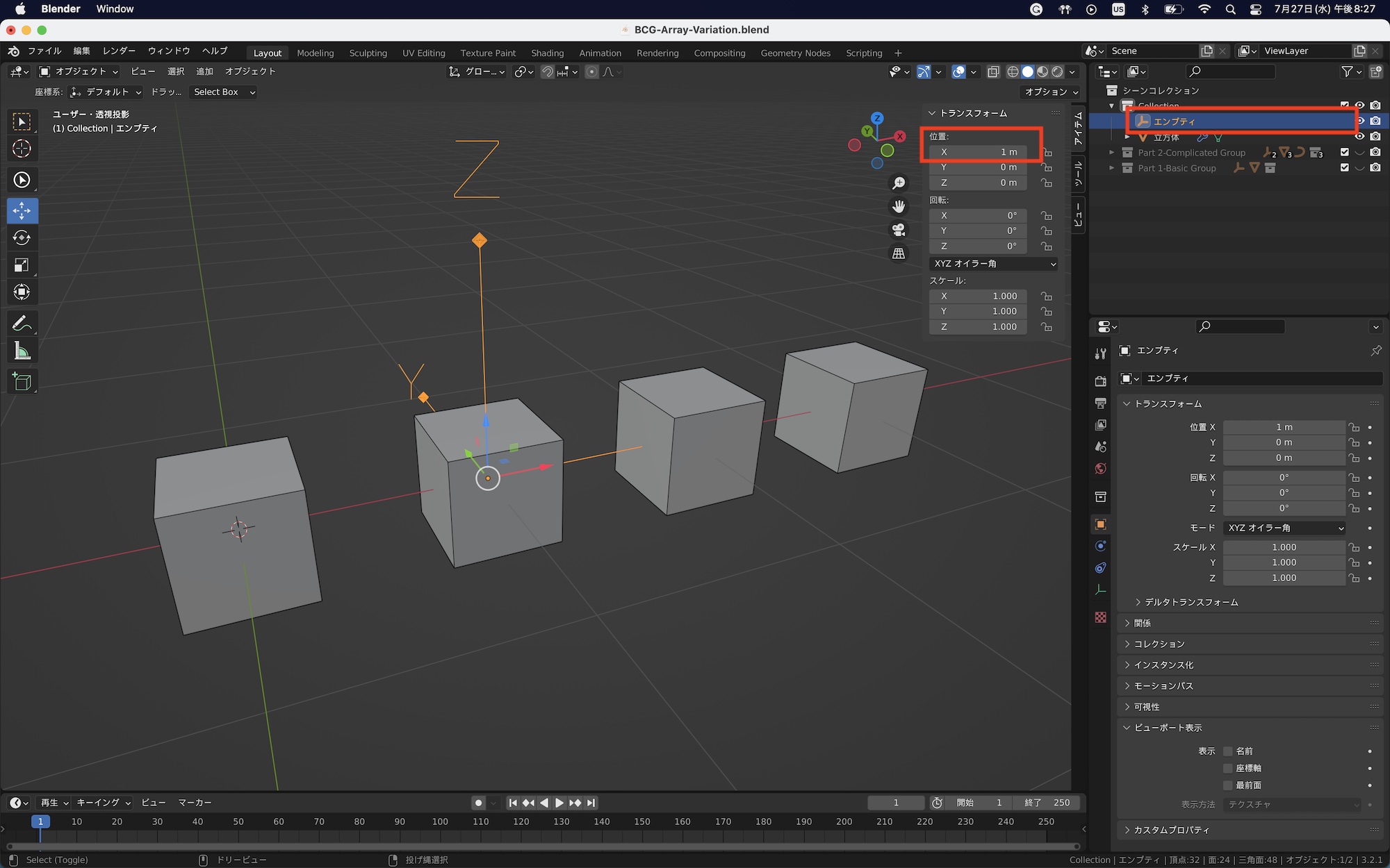 このままだと何も起きませんが、エンプティの位置を「1m」動かすと、それに合わせてクローンが1mずつ移動します。