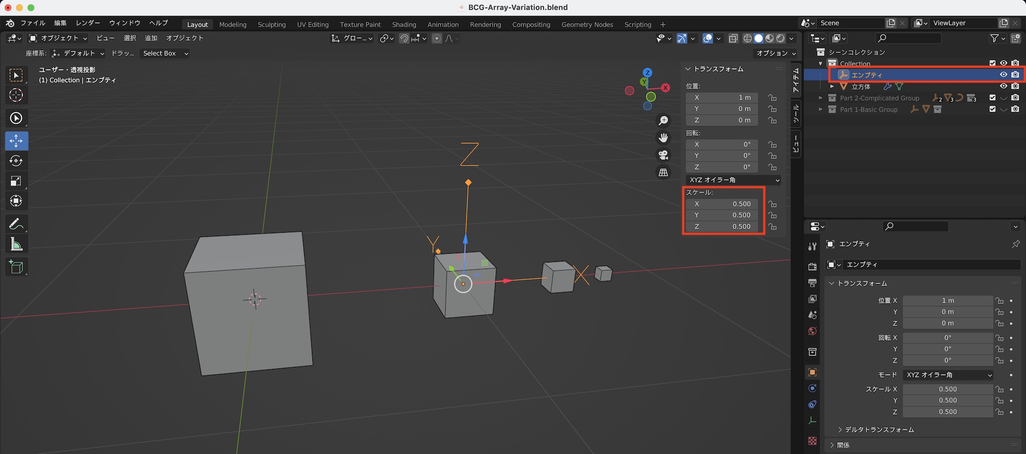 次にエンプティのスケールを「0.5」に指定してみると、3番目以降のオブジェクトも0.5の倍率ずつ小さくなります。このように指定するオブジェクトのスケールや回転、位置にあわせてクローンしたオブジェクトが変化します。