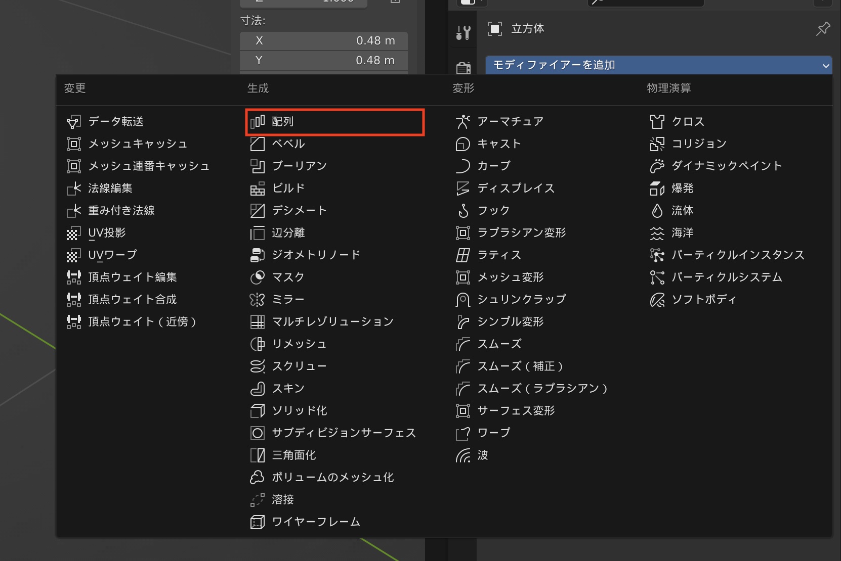 オブジェクトのクローンを行うには適用するオブジェクトを選択して、プロパティの「モディファイアー」にある「モディファイアーを追加」から「配列」をクリックし、モディファイアを追加します。