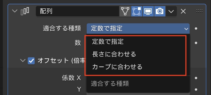 「適合する種類」ではオブジェクトのクローンの指定方法を変更します。デフォルトの「定数で指定」は前述した「数」を指定したもので、「長さに合わせる」と「カーブに合わせる」では指定した長さまたはカーブの長さに合わせて自動でクローンの数が指定されます。
