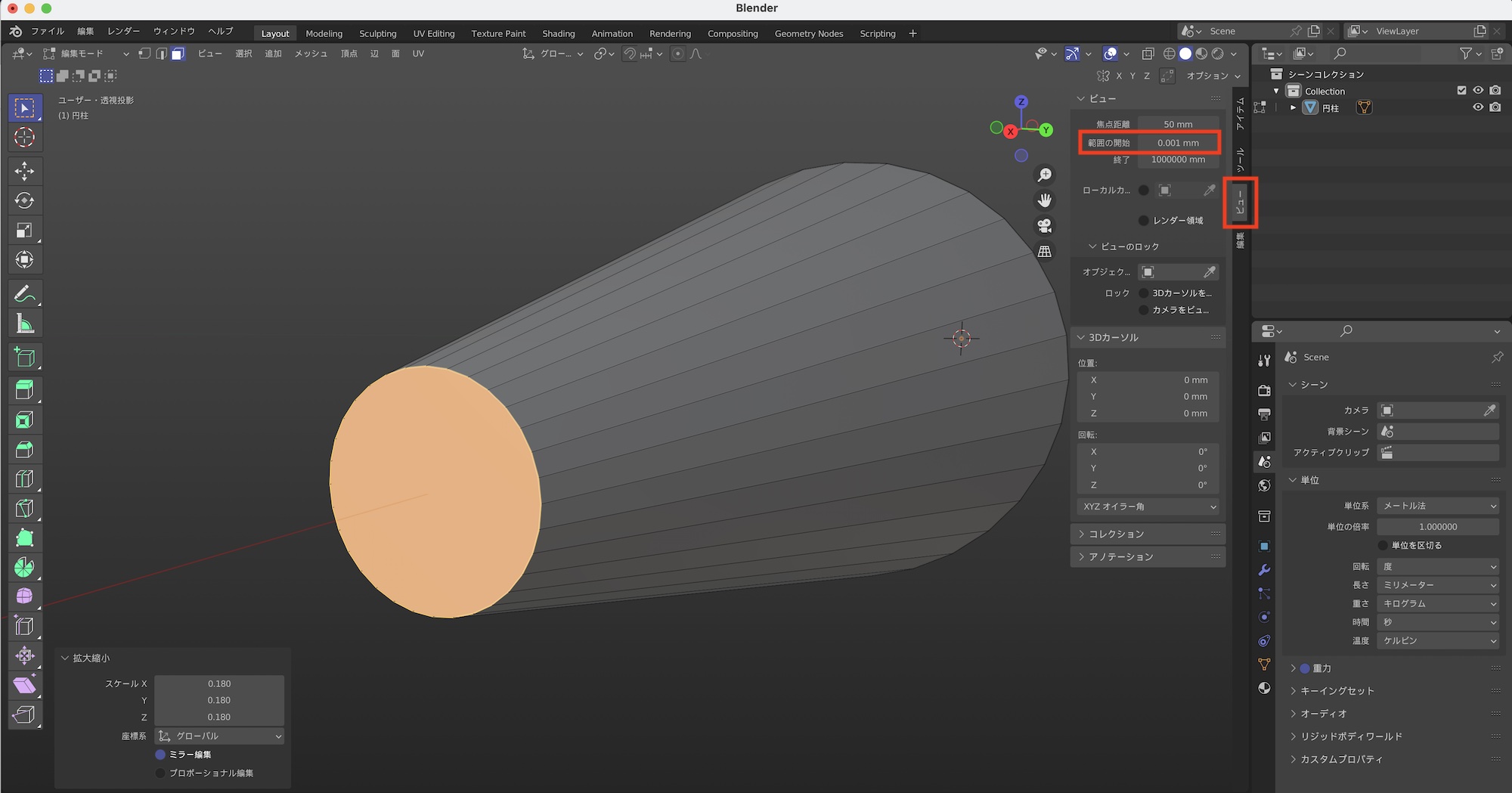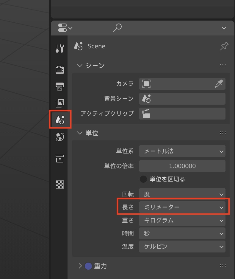 今回はボールペンを原寸大にしたいので、シーンプロパティの「単位」の項目から「長さ」を「ミリメーター」にします。