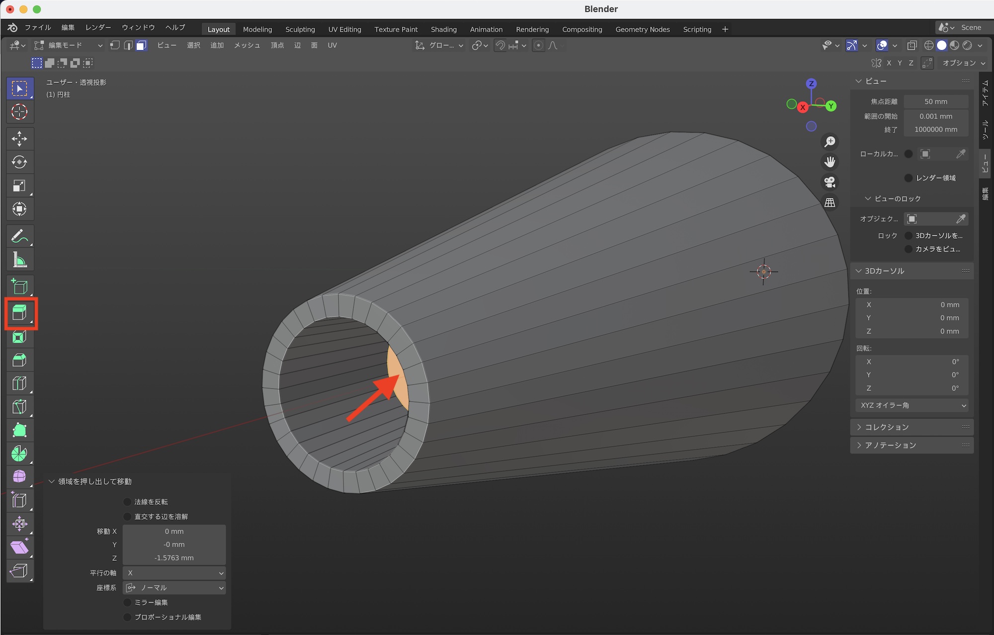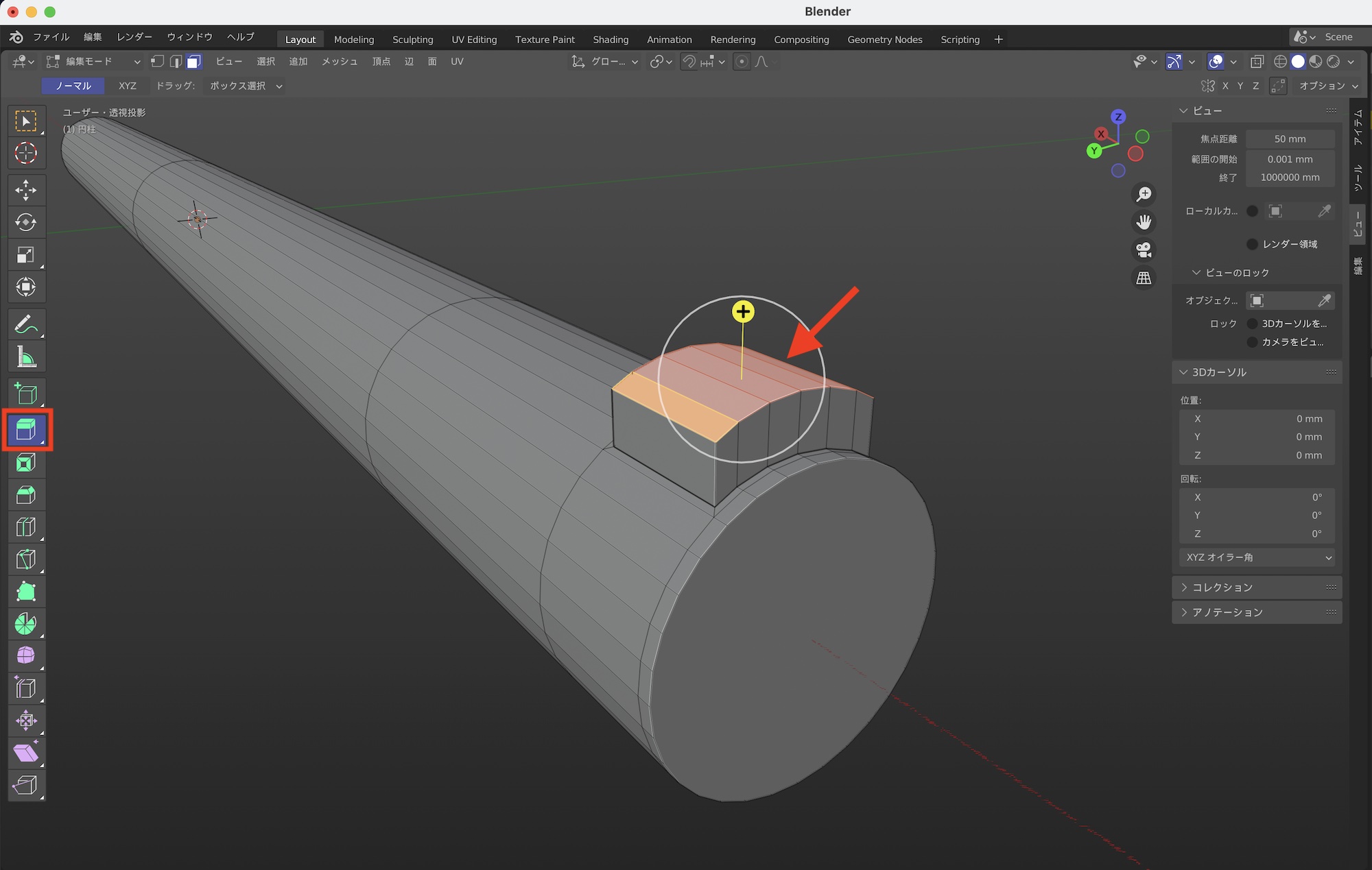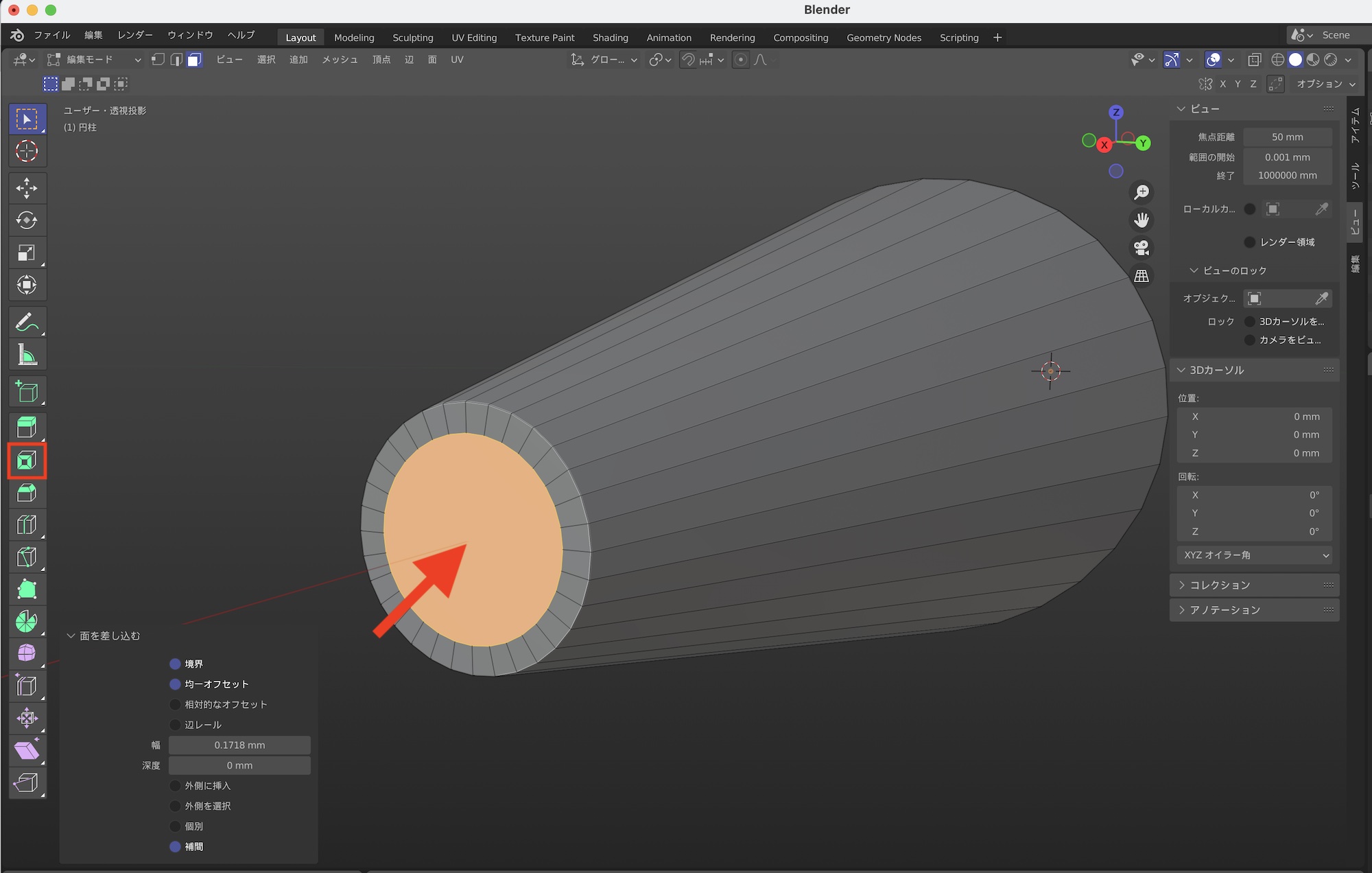 クリップ部分の円柱の面を選択して、面を差し込むと押し出しを組み合わせて、ディテールを追加します。