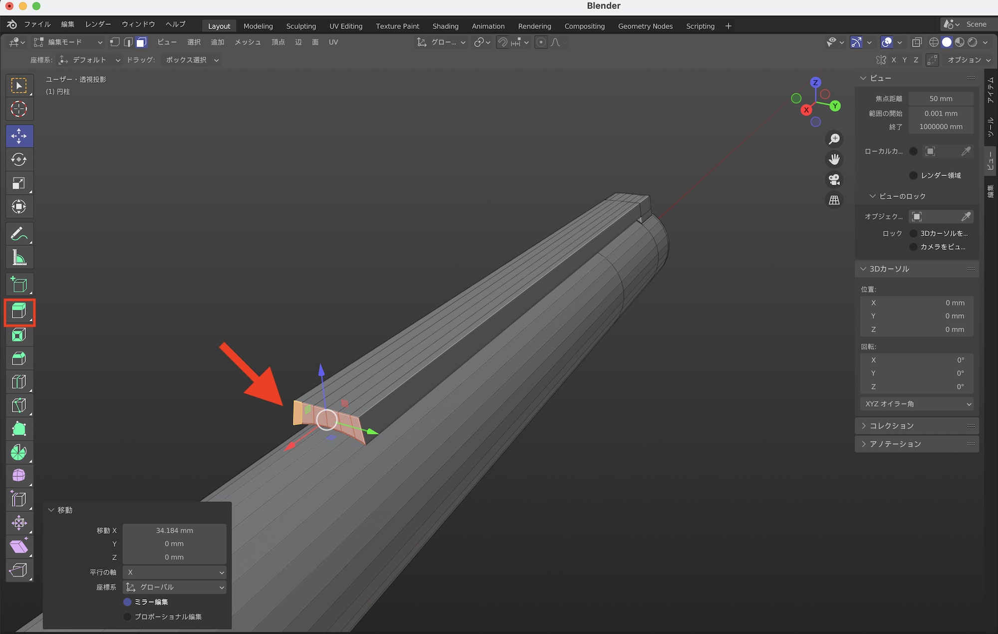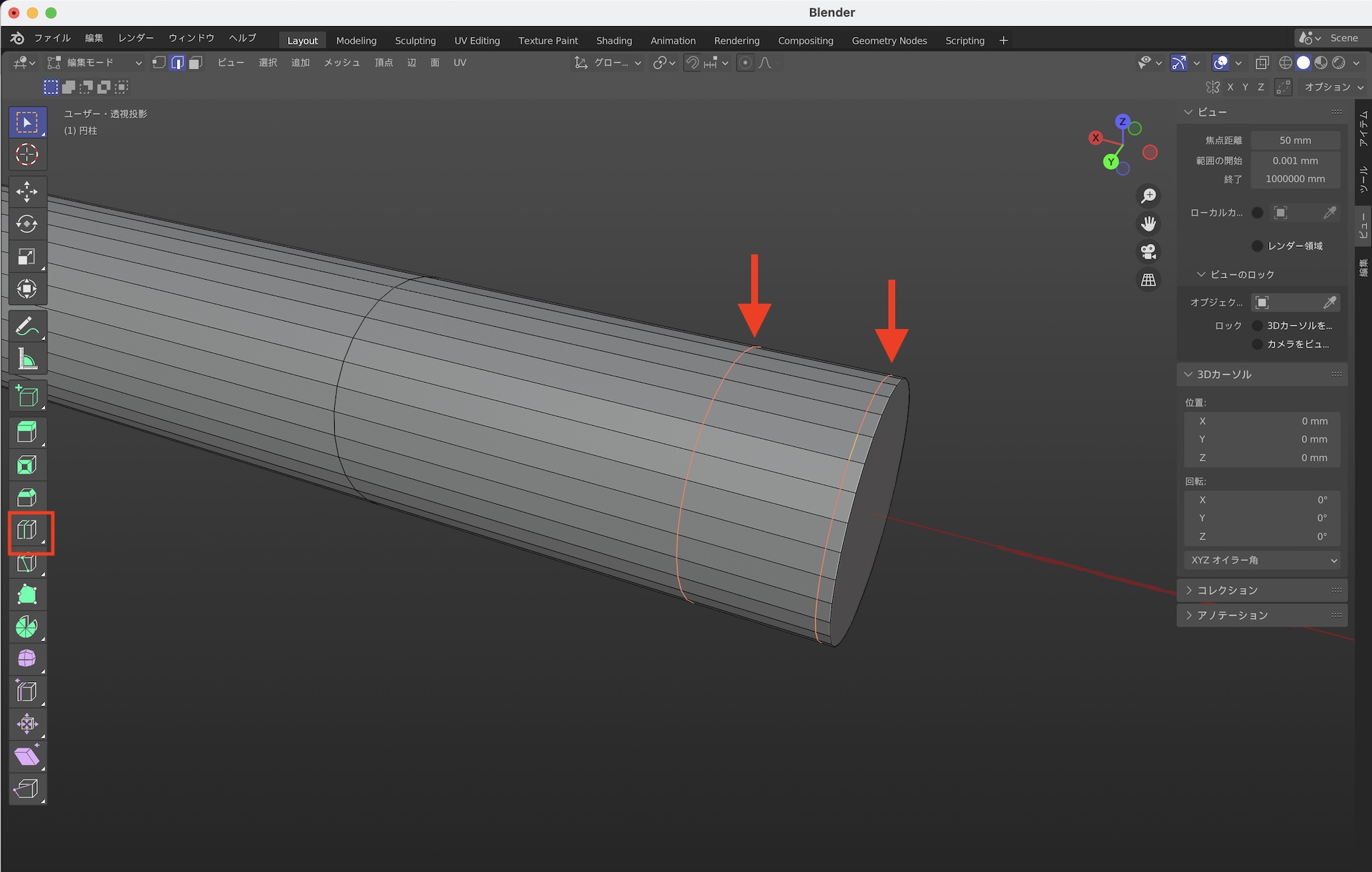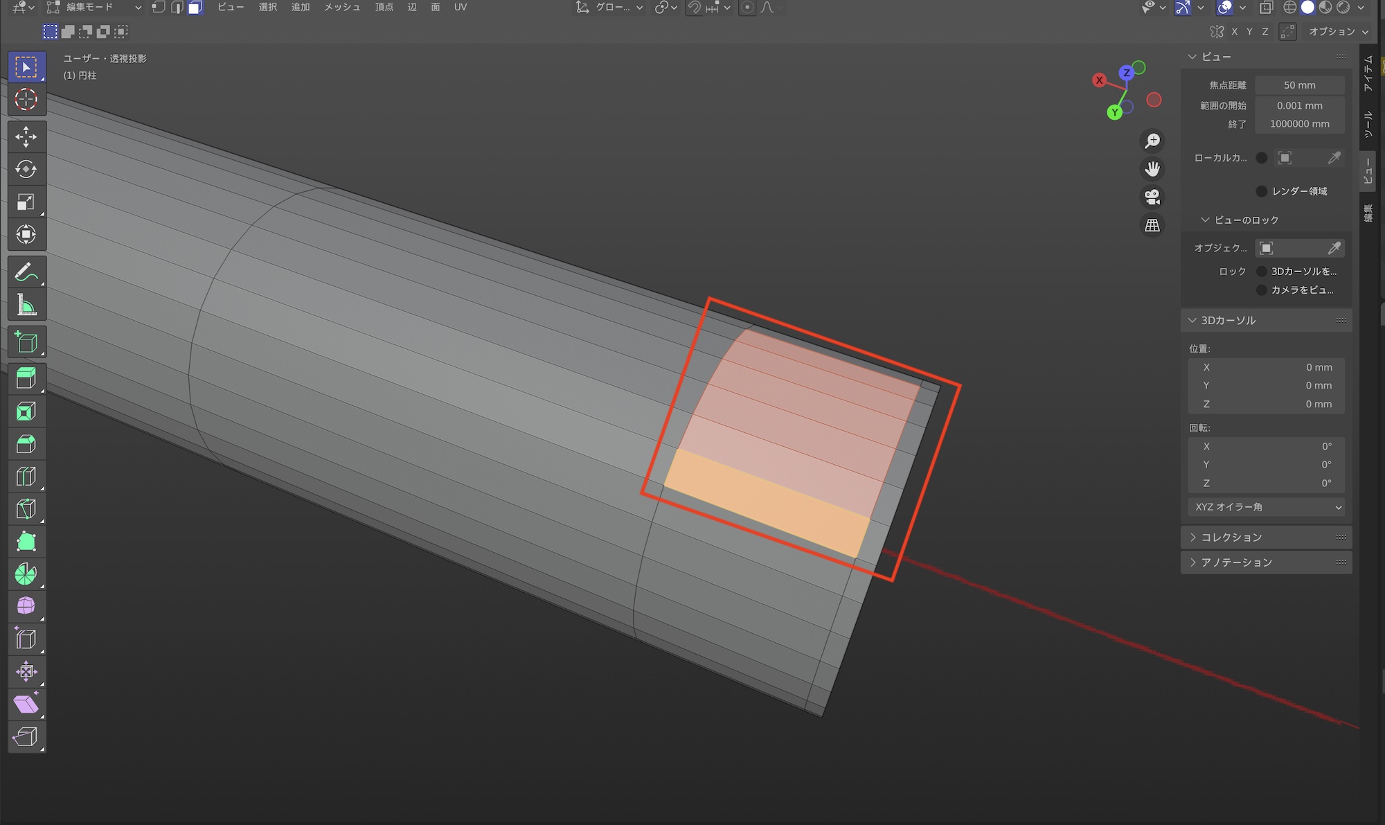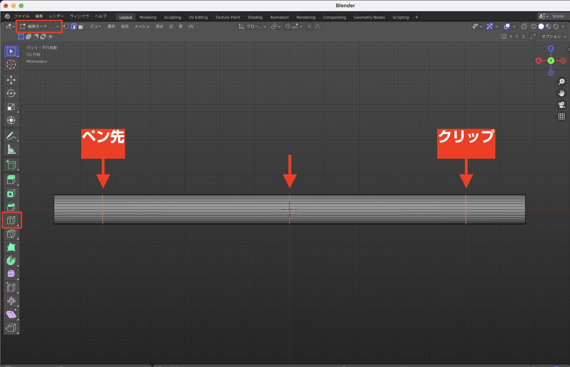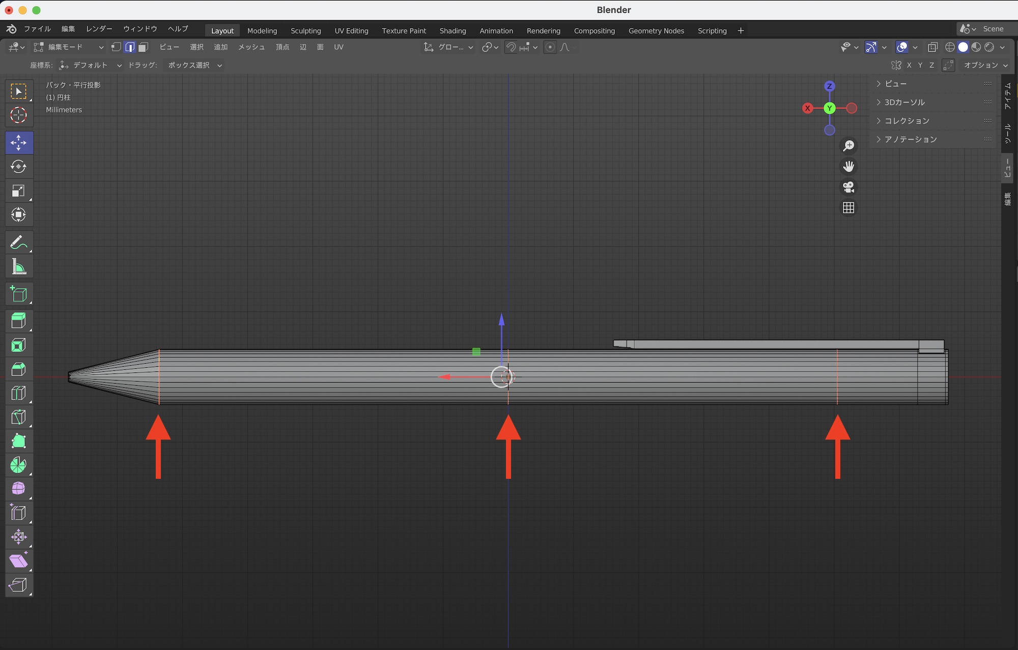 オブジェクトモードにした後、Y軸を面にした平行投影に切り替えて「ループカット」または「Control + R」で、円柱の中央と両端にループカットを施します。筆者の場合、左側がペン先、右側がクリップ部分となるので、ある程度距離を確保してカットしています。