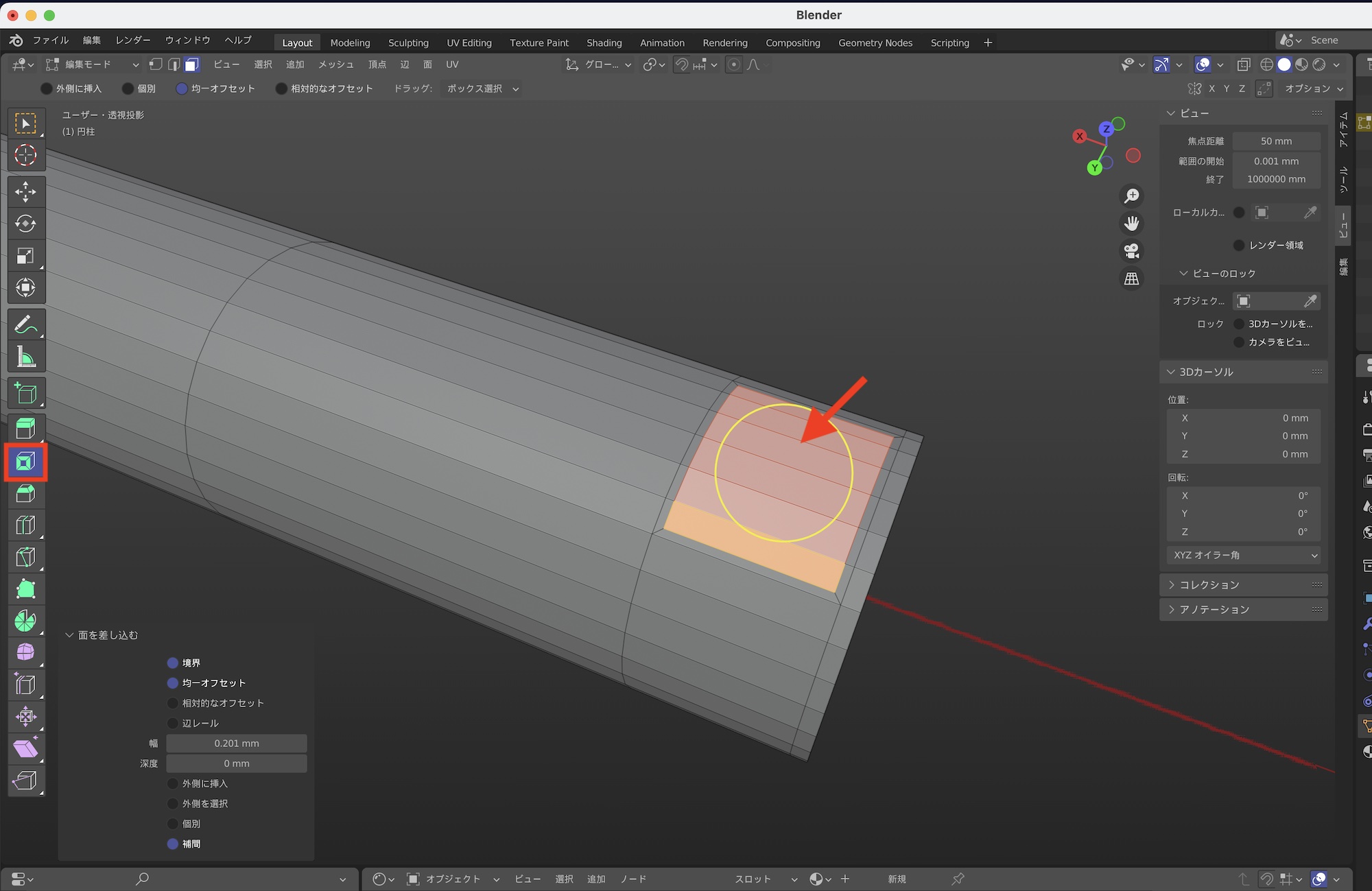 続けて「面を差し込む(I)」で内側に面を作成した後は「押し出し(法線方向)」を使って溝を作成します。