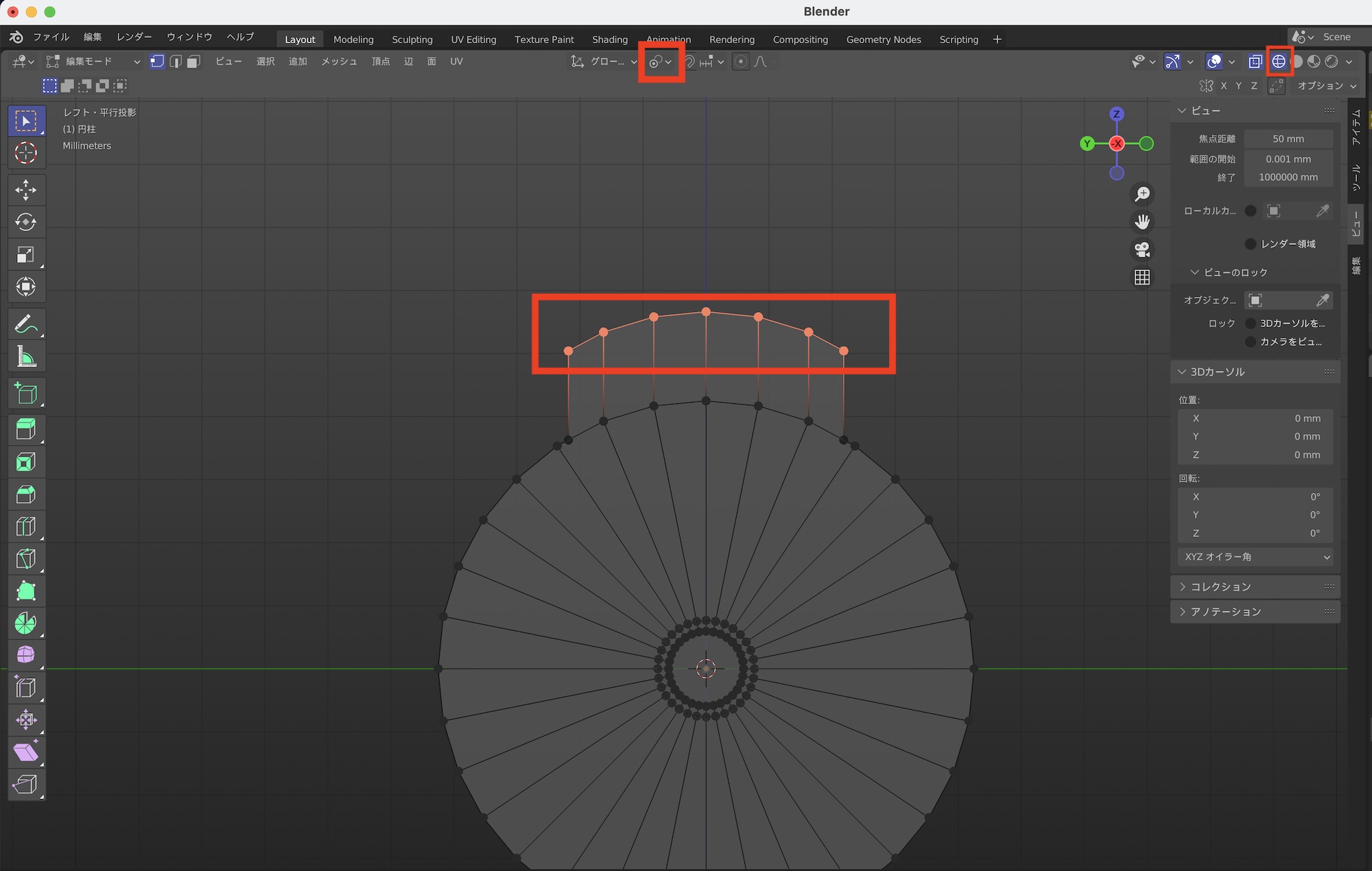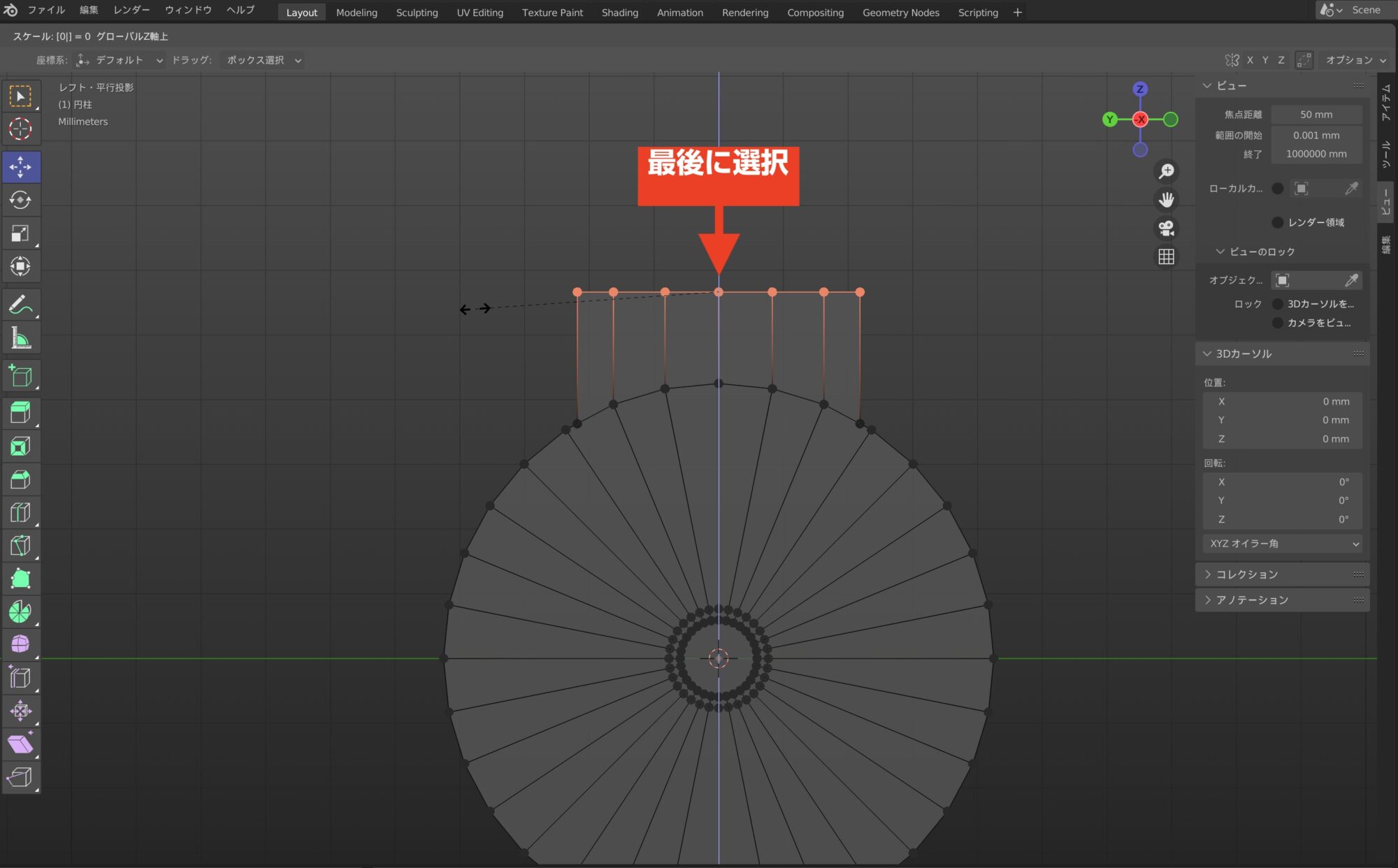 視点をX軸に切り替えてビューポートの表示を「ワイヤーフレーム」にします。押し出した面の頂点を全て選択して、ビューポート上部のトランスフォームピボットポイントを「アクティブ要素」にし、中央の頂点を選択します。