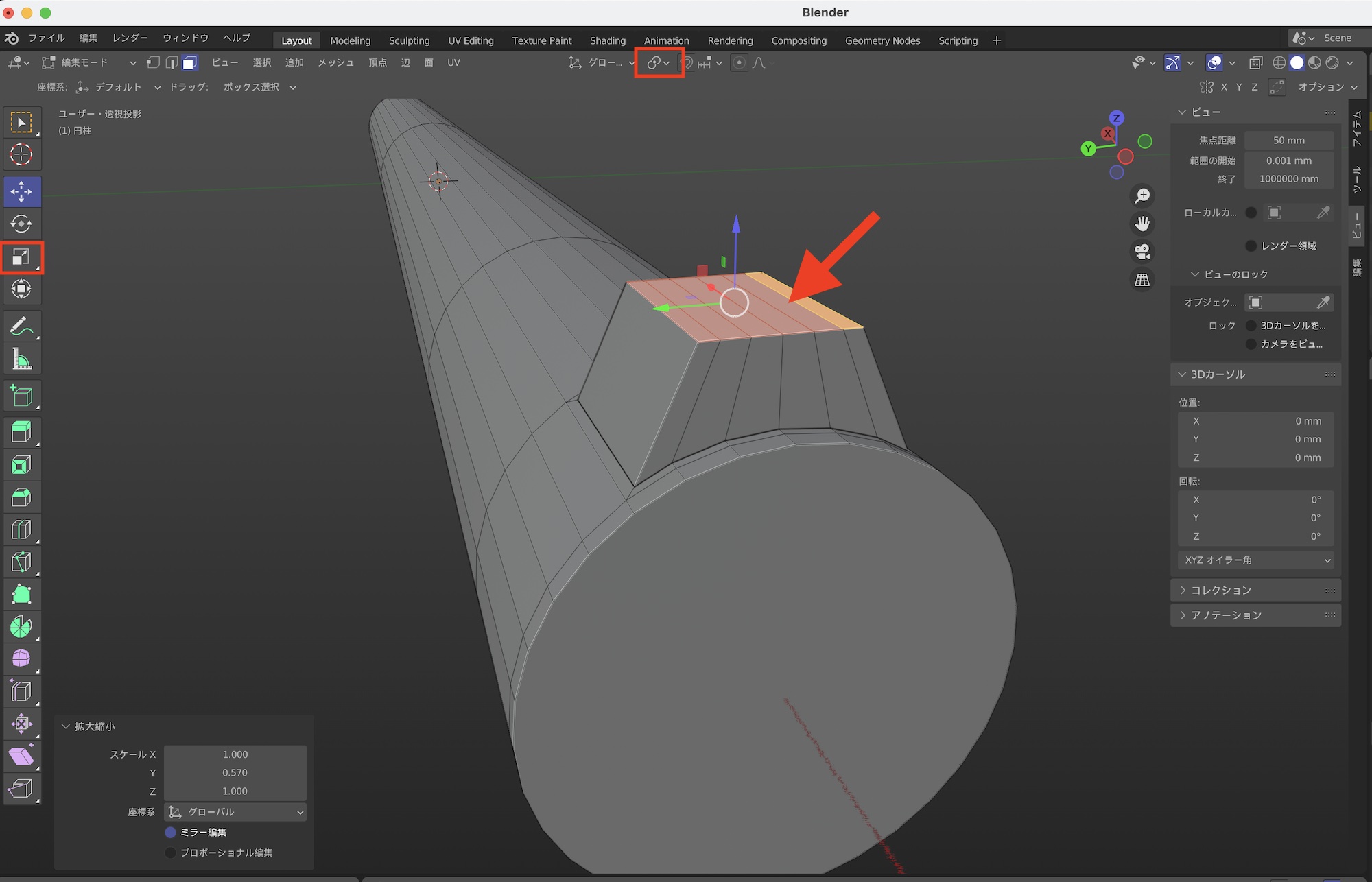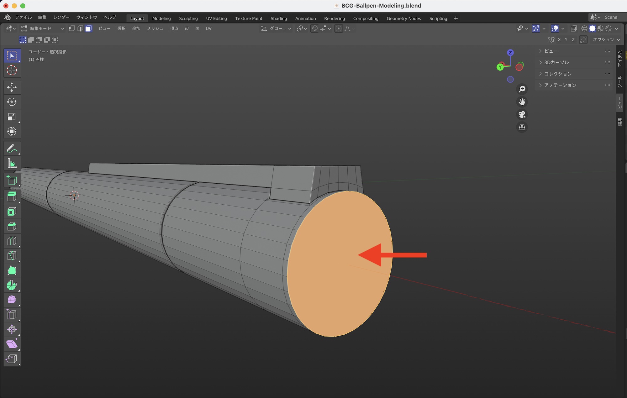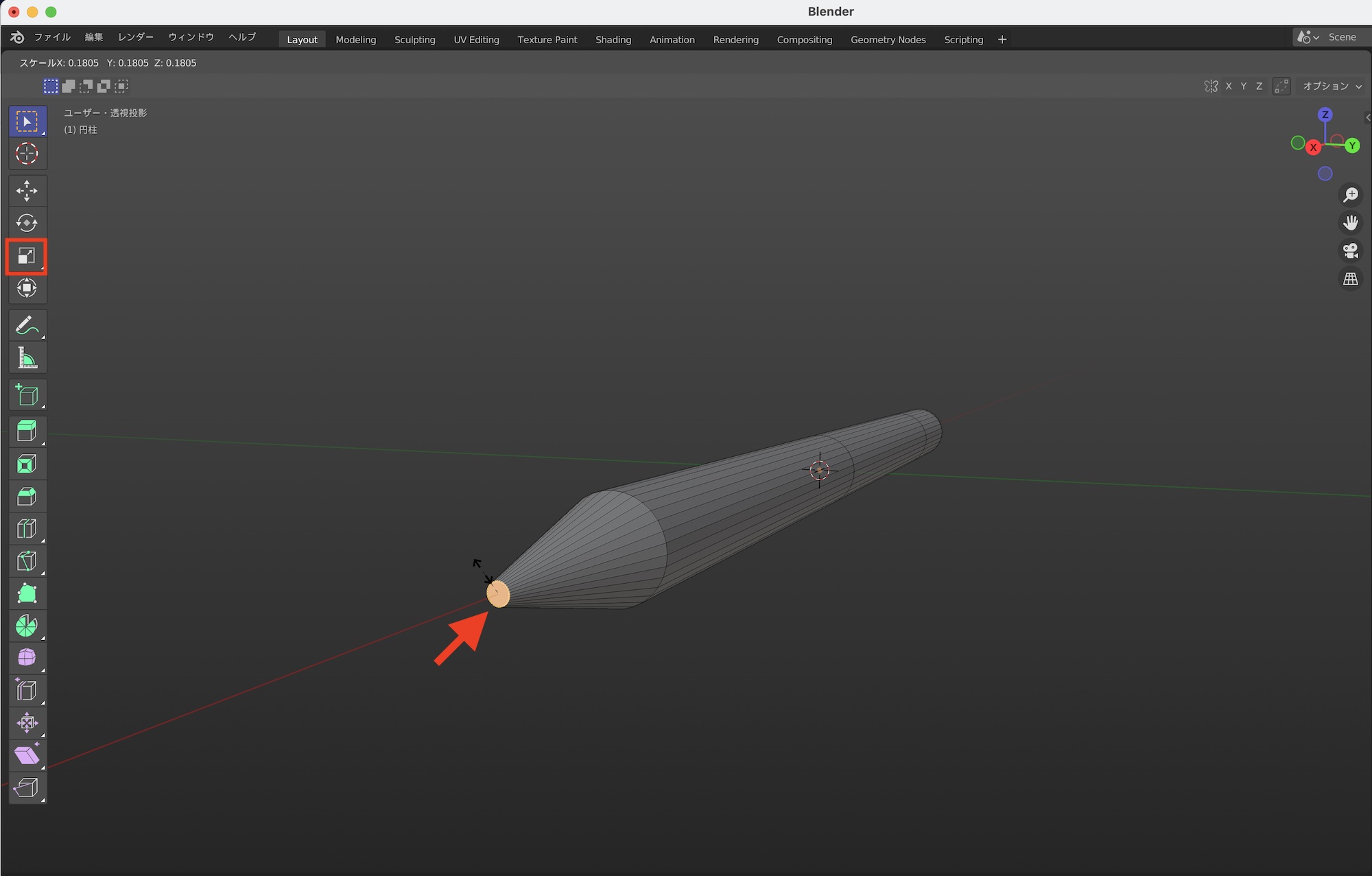 ペン先部分となる円柱の面を選択して、スケールツールまたは「S」キーを使って小さくします。