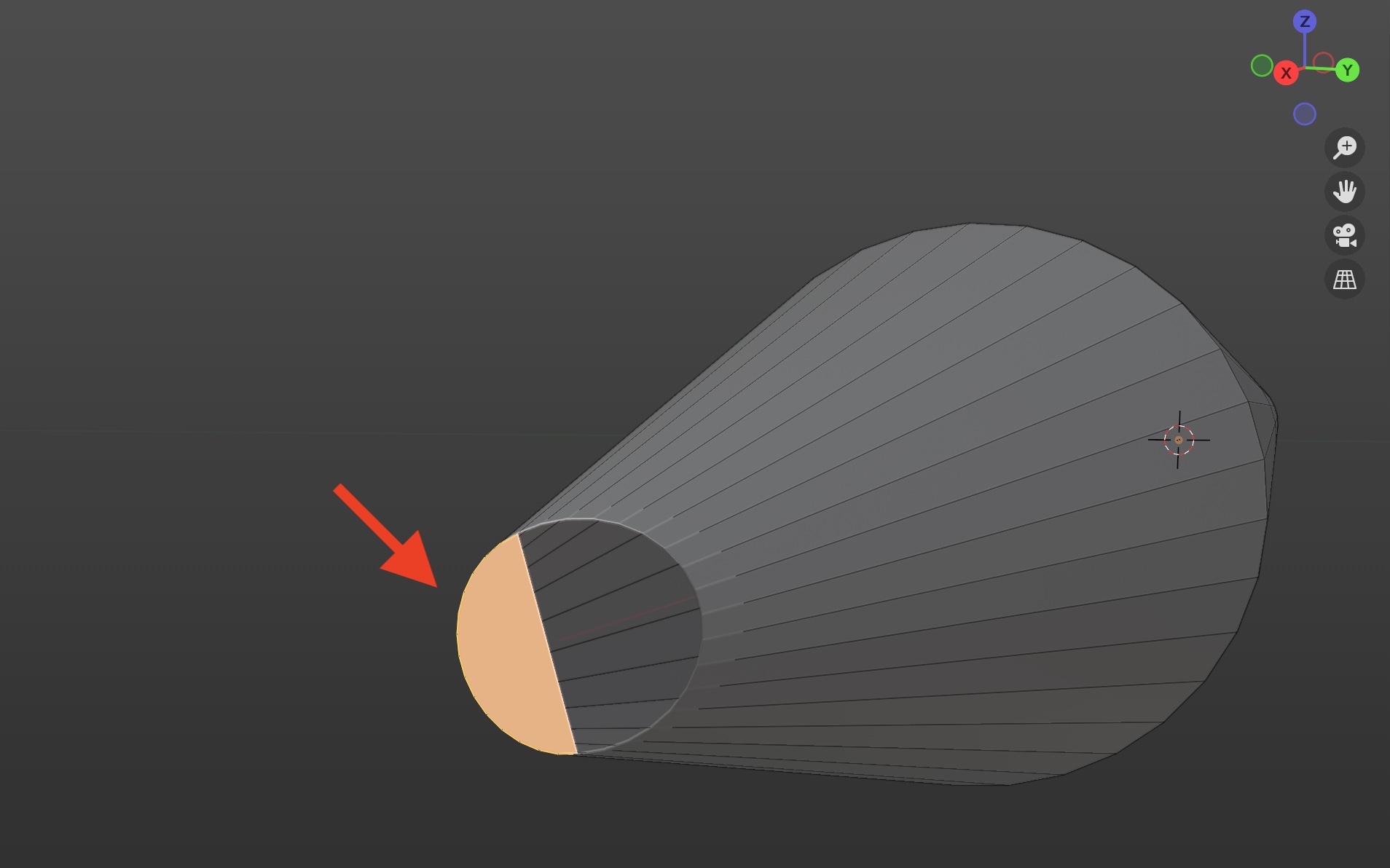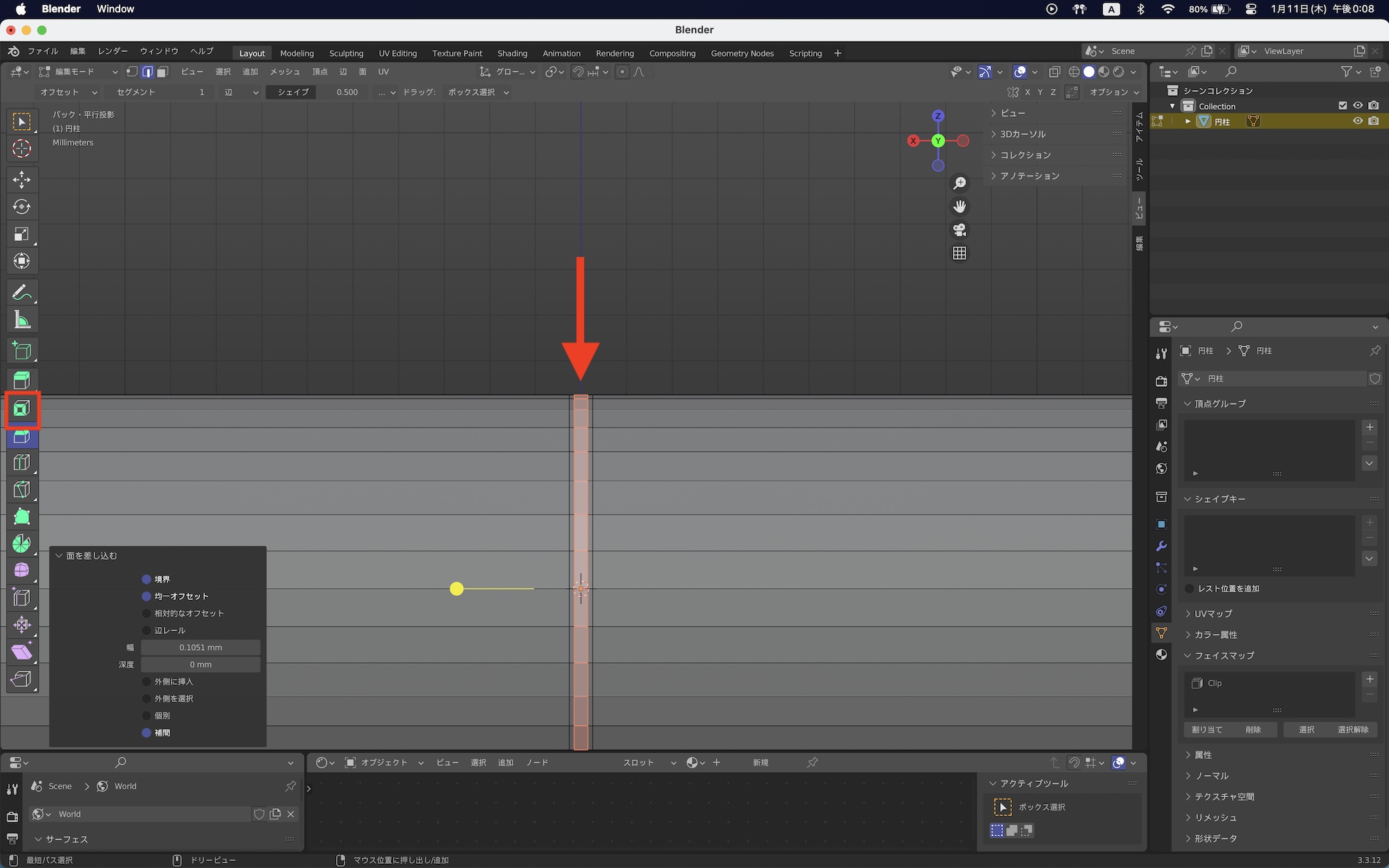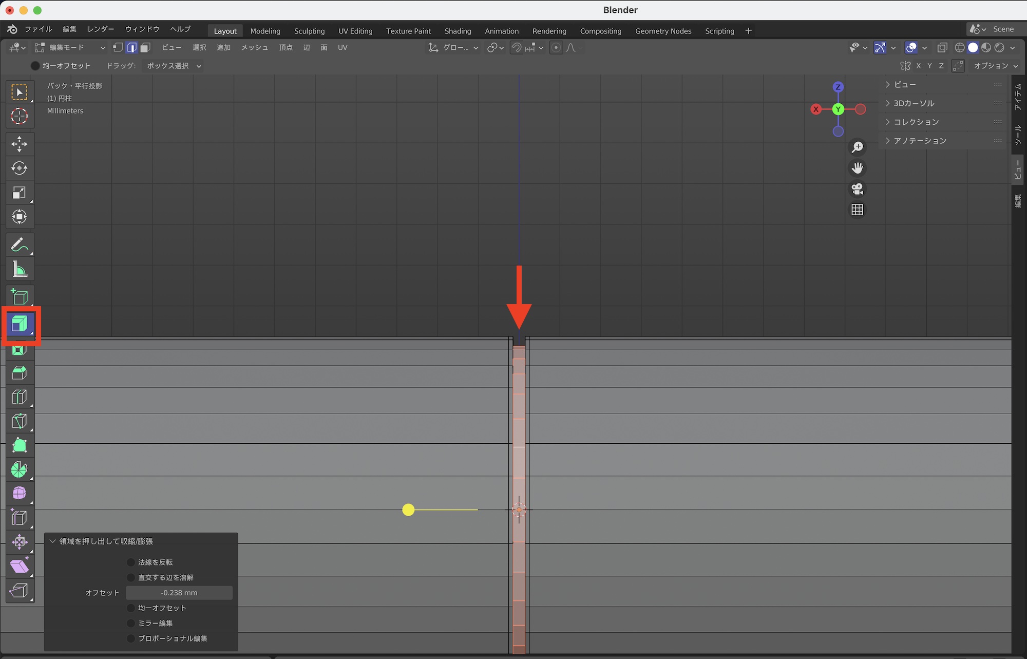 ペン先部分となる円柱の面を選択して、スケールツールまたは「S」キーを使って小さくします。