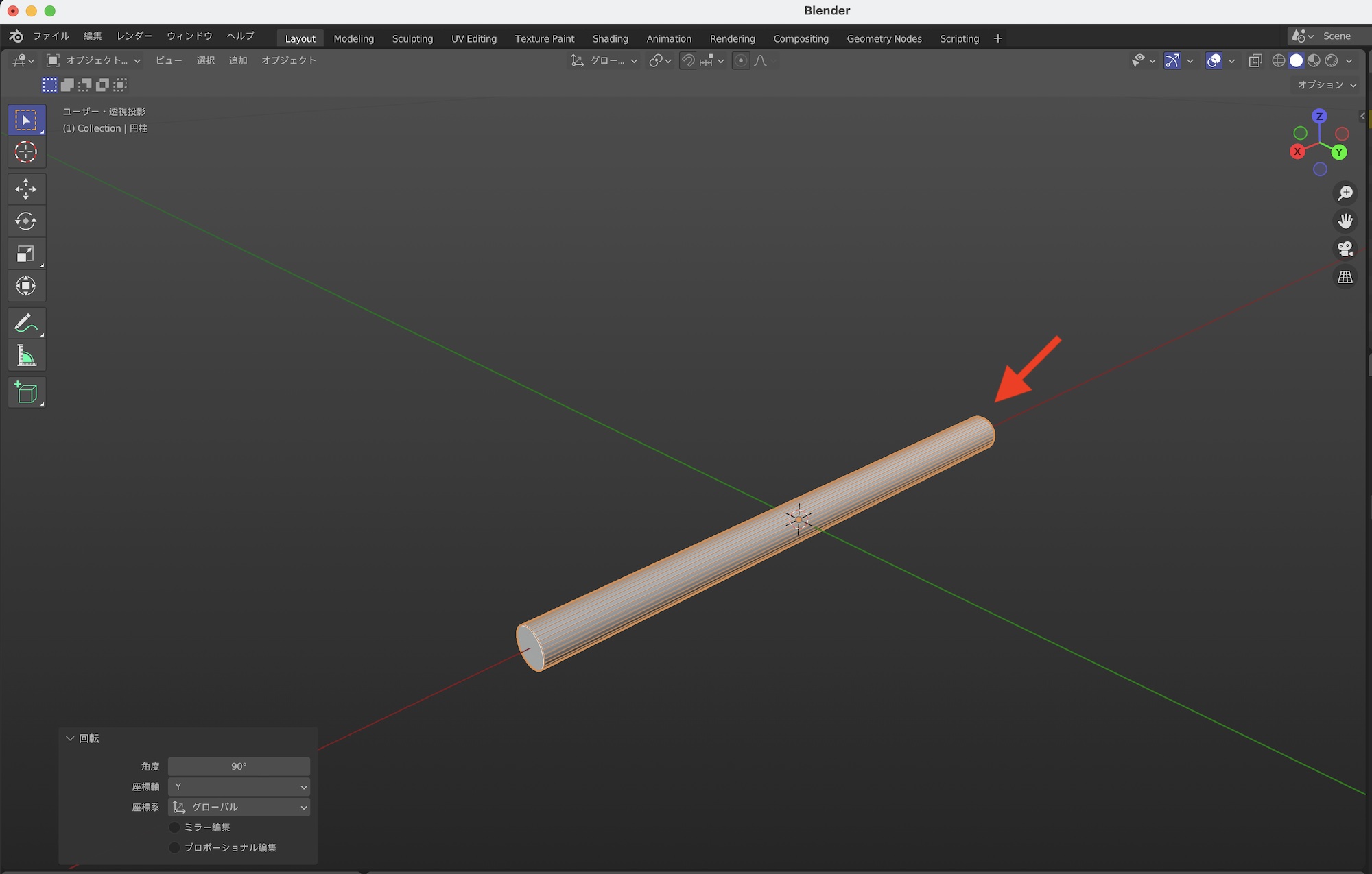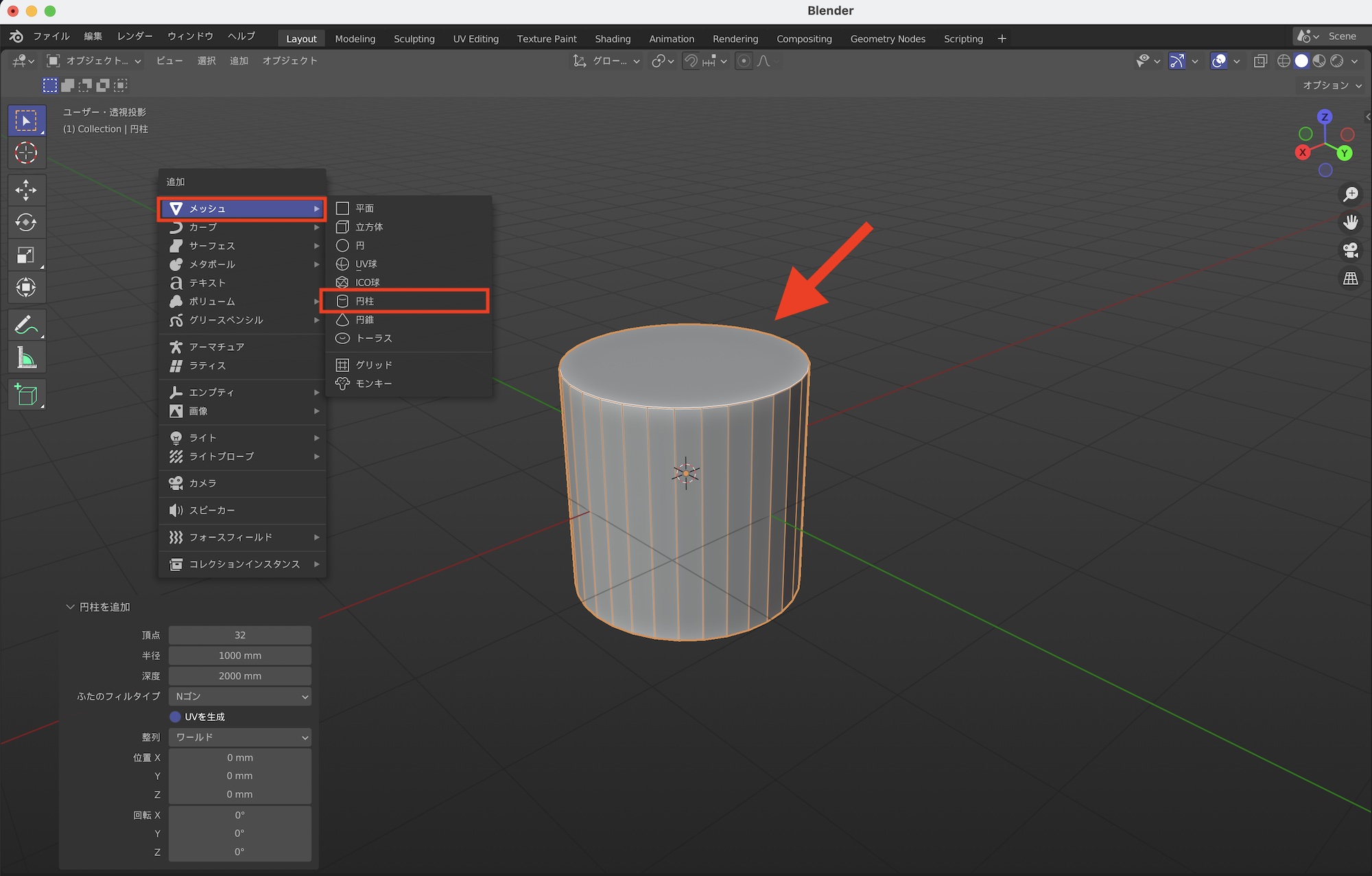「Shift + A」または上部メニューの「追加」、「メッシュ」から「円柱」を選択して、ビューポートに追加します。