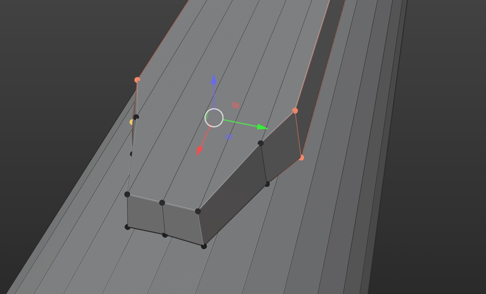 次に押し出した面の上部を全て選択して、トランスフォームピボットポイントを「中点」にした上で、「S + Y」キーを使って、Y軸方向に縮小します。