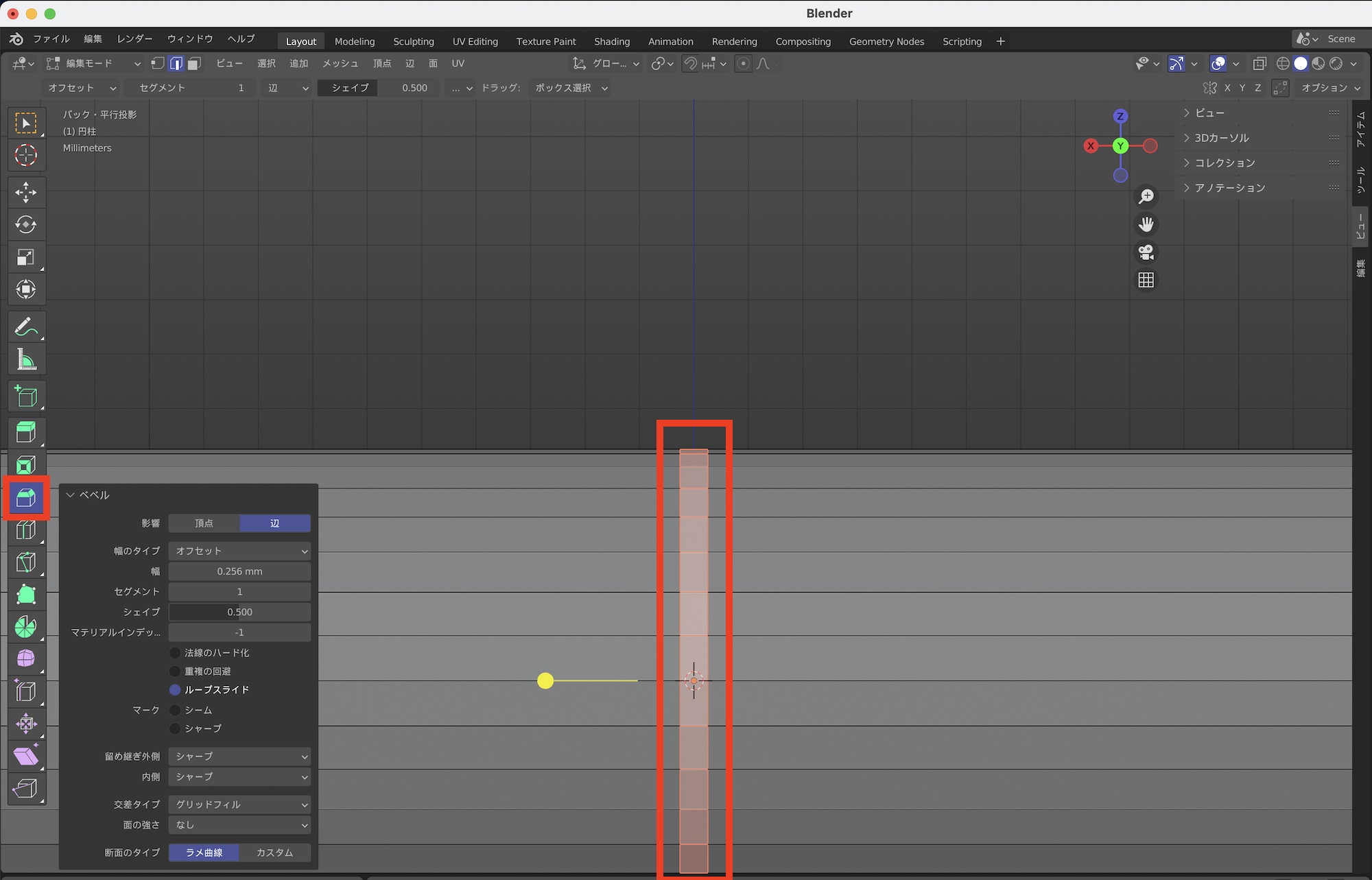 ボールペンの周りを走る3つの辺をループ選択(Alt(Option) + 左クリック)で選択し、ベベルツールを使って小さい面を作成します。