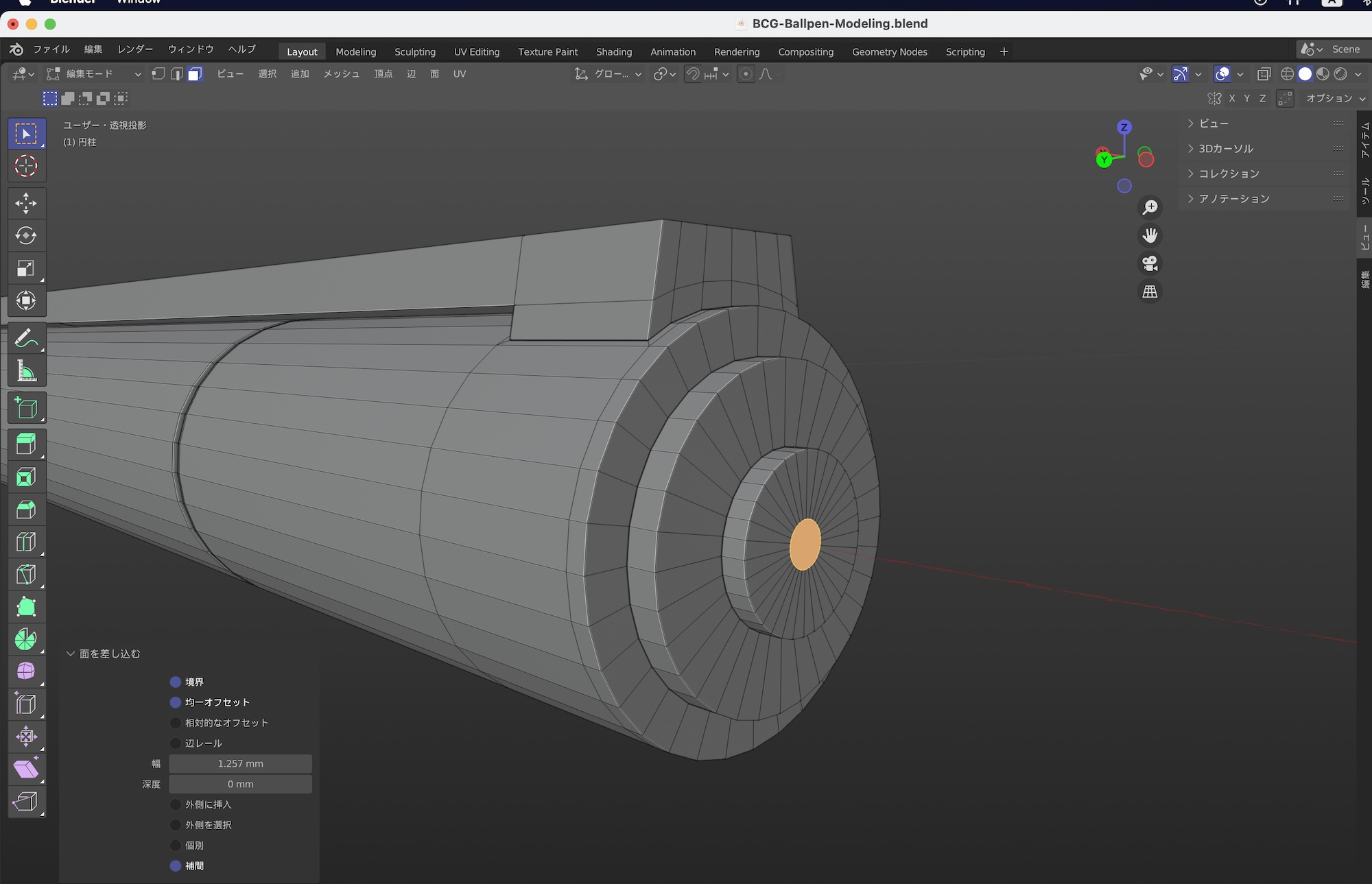 先端の面が選択されている状態で「面を差し込む(I)」で内側に新しく面を作成し、「押し出し(E)」でペン先の中の部分を作成します。