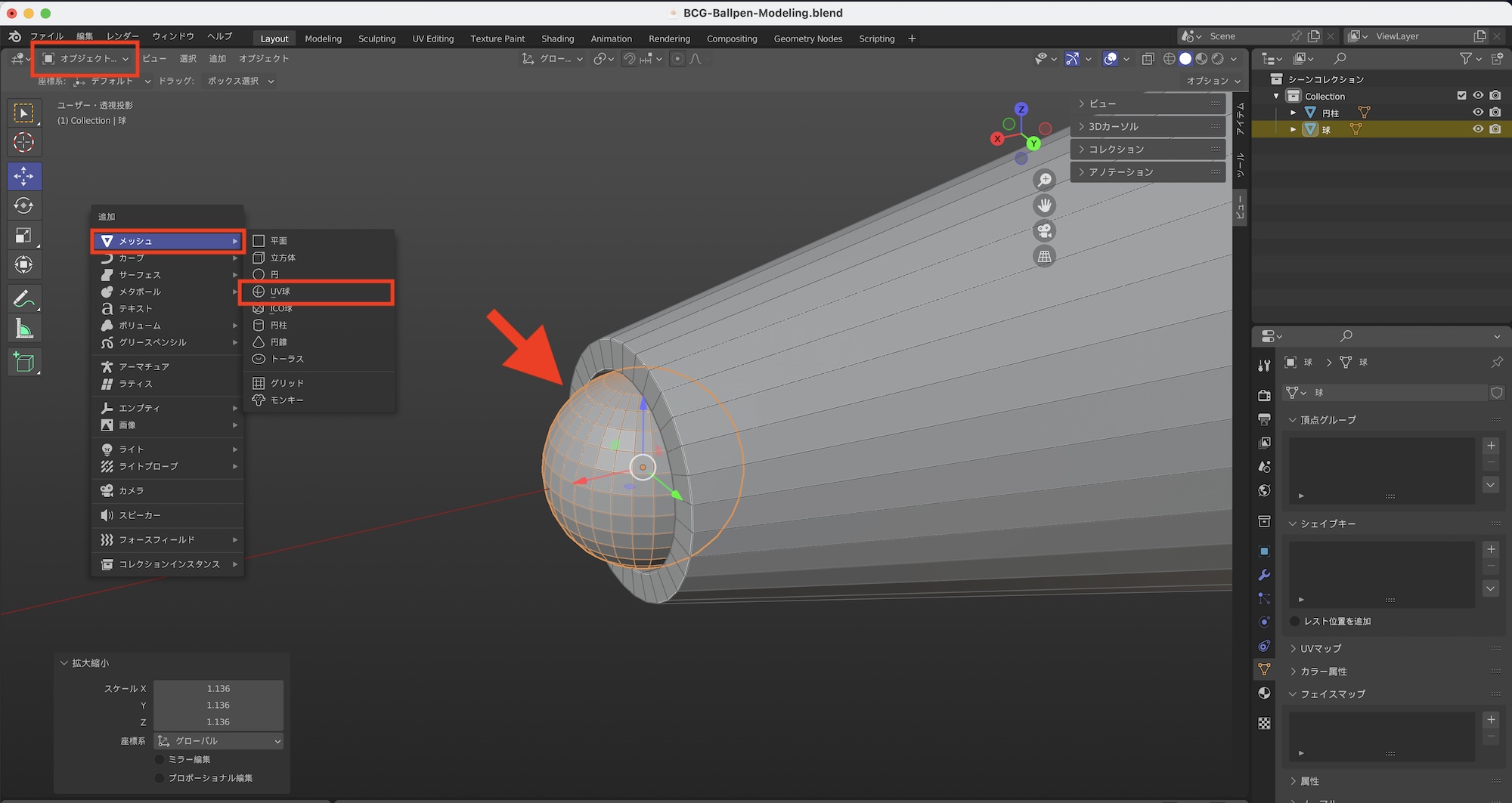 オブジェクトモードに切り替えて、「Shift + A」または上部メニュー「追加」、「メッシュ」から「UV球」を選択して、ペン先のボールになるようにスケールや位置を調整します。
