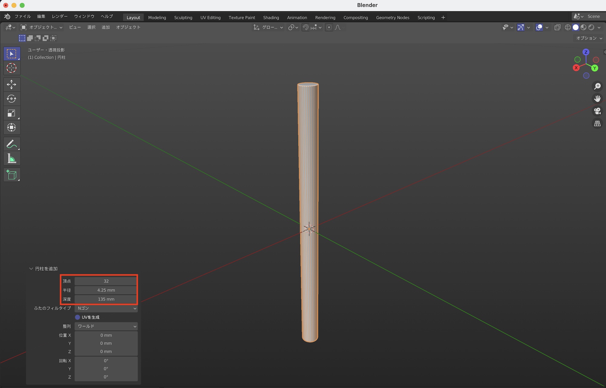 左下に表示されるオプションで「頂点:32」、「半径: 4.25mm」、「深度:135mm」にして、回転ツールまたは「 R + Y + 90」でY軸方向に90°回転します。