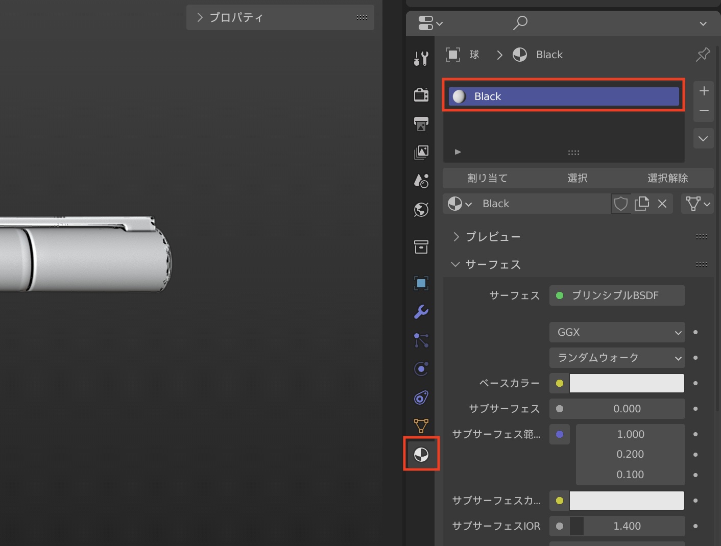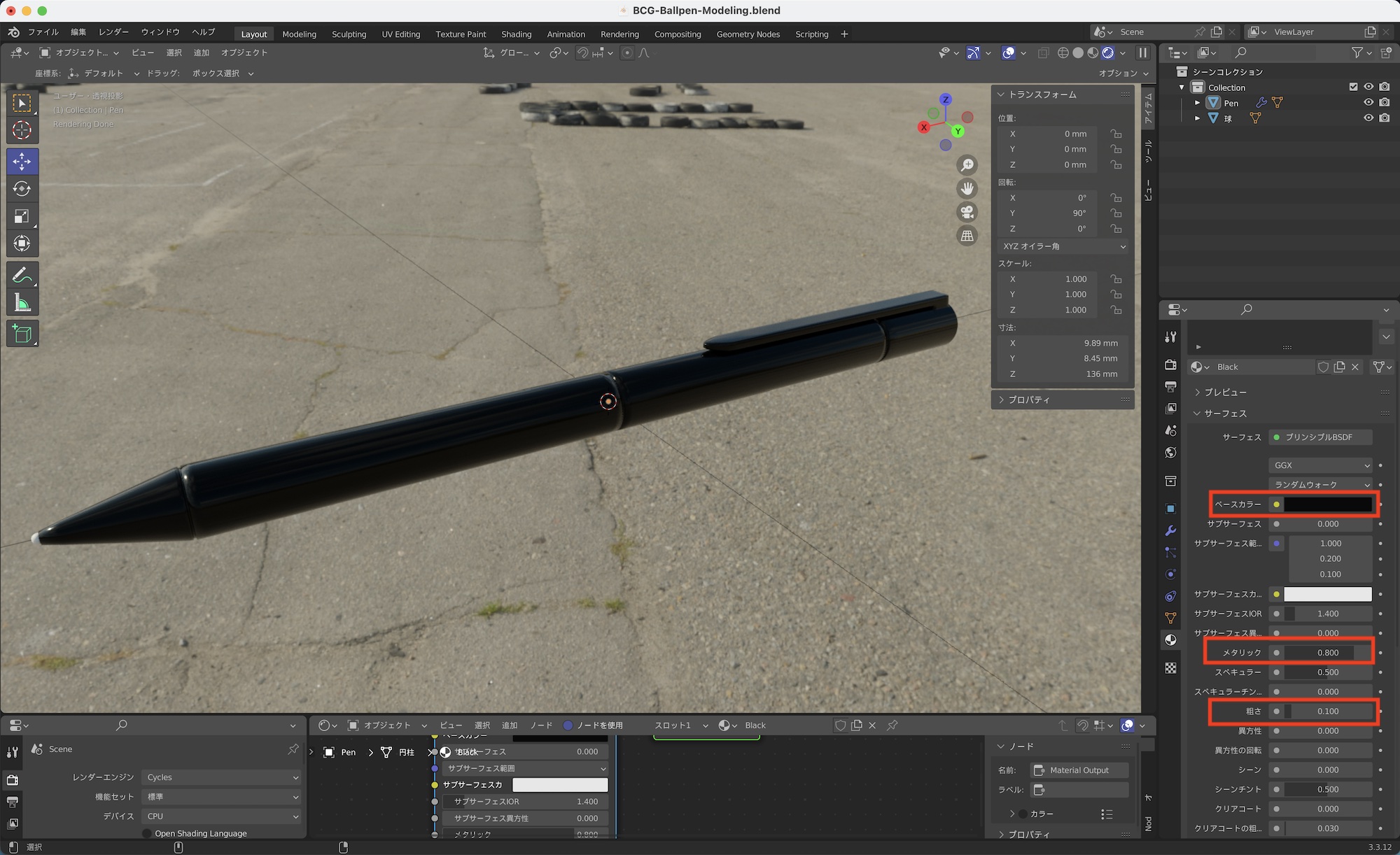 「Pen」を選択した上で、マテリアルプロパティから「新規」をクリックしてプリンシプルBSDFを追加します。最初に反映するマテリアルは黒い光沢のものにしたいので、マテリアル名を「Black」などに変更して「ベースカラー」を黒色に、「メタリック: 0.8」、「粗さ: 0.8」にします。