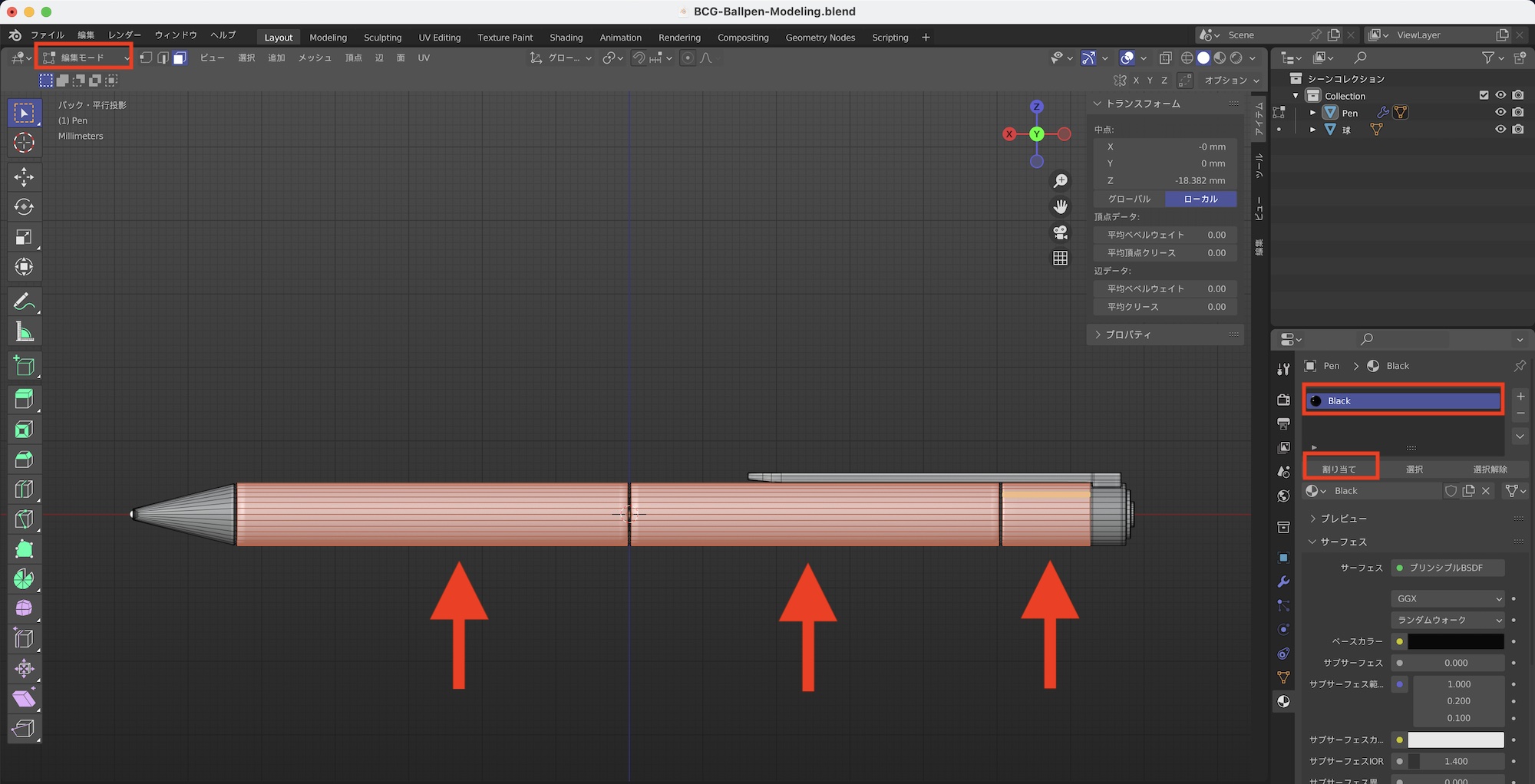 ビューポートを「3Dビューのシェーディング」にして確認してみると、上のようにボールペン全体に色が反映されているのがわかります。