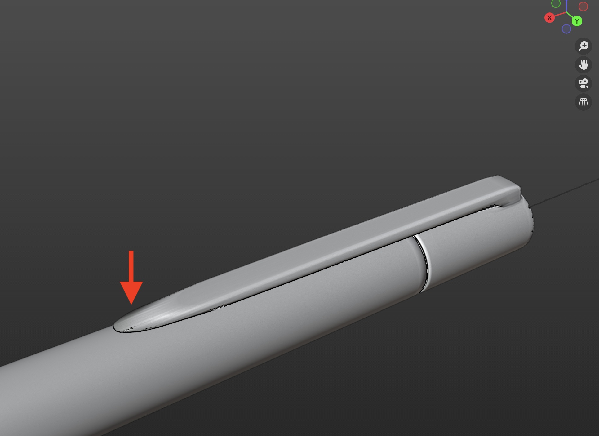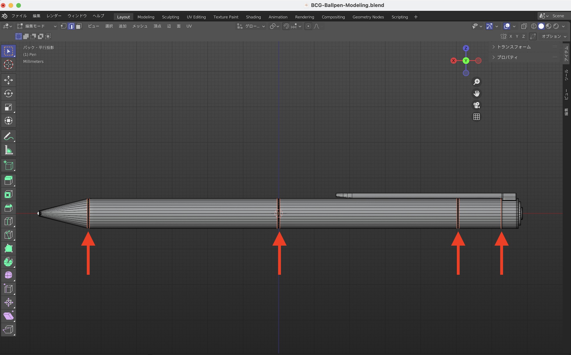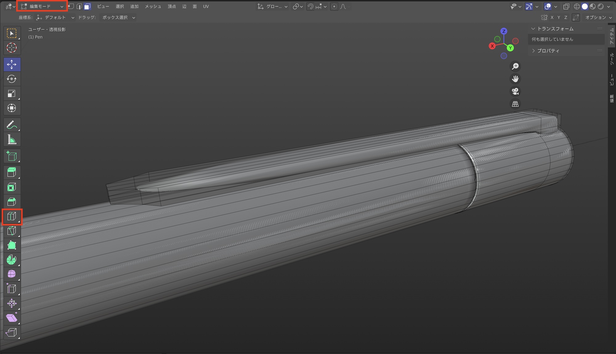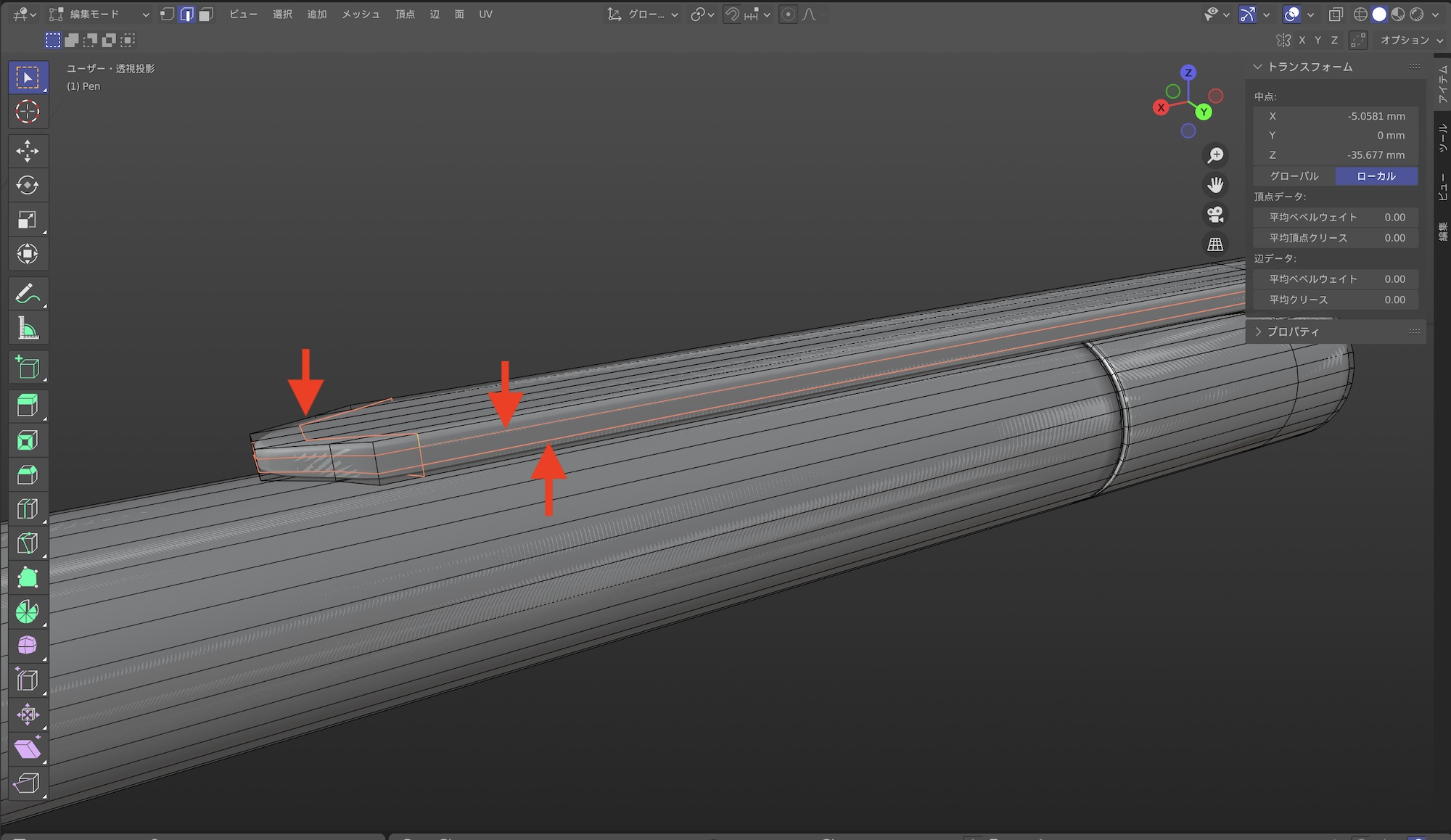 ペンの後ろの部分もよりシャープにしたかったので、下の写真のようにループカットをいくつか追加しています。
