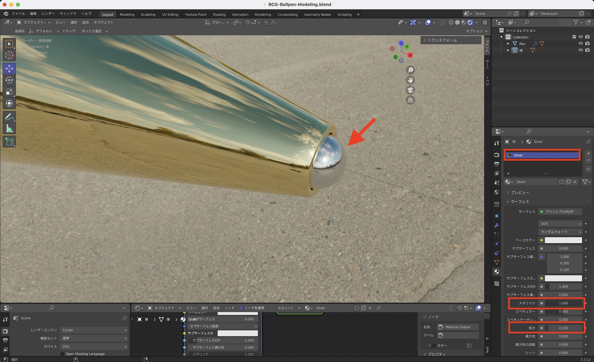 最後はペン先にある球体にも銀色のマテリアルを適用します。球体を選択した上で、新規マテリアルを作成し、「メタリック: 1」、「粗さ: 0.1」にしました。