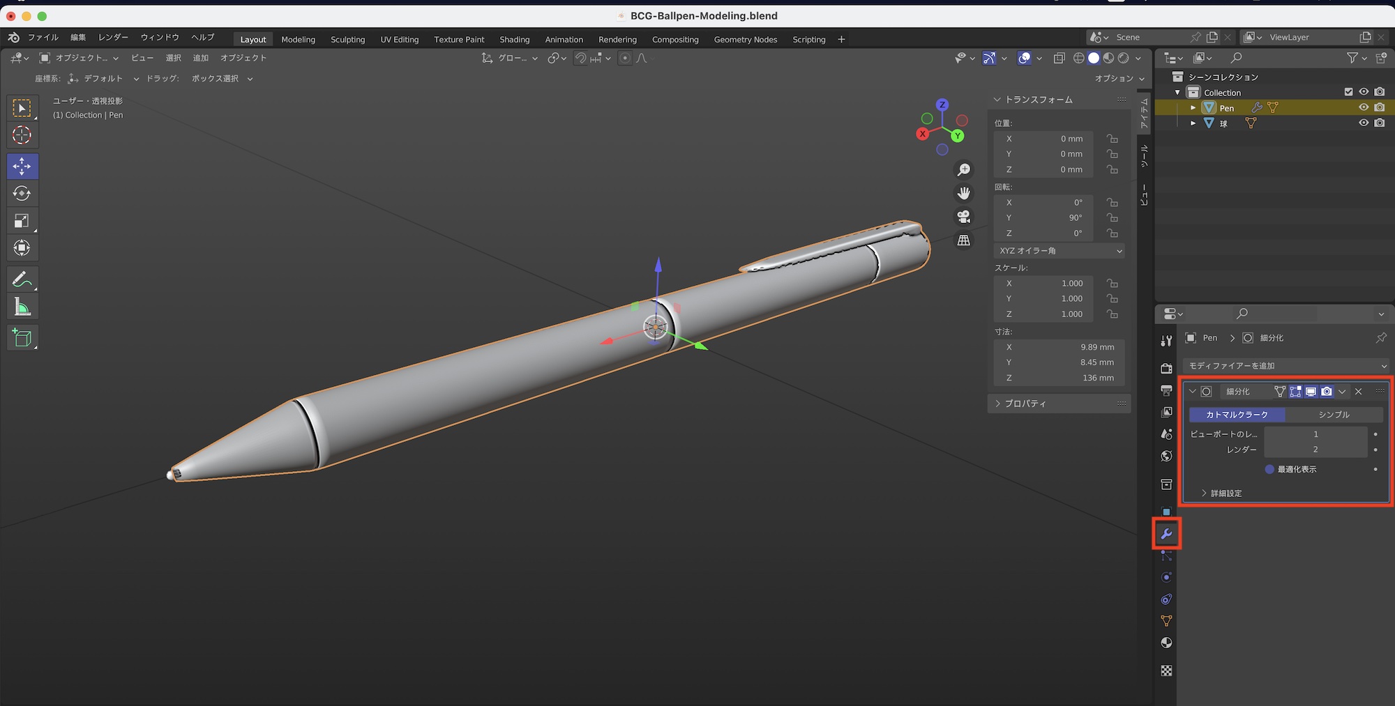 「Blenderで高級ボールペンをモデリングしてみよう!その1」の続きのこちらの記事では、作成したメッシュにサブディビジョンサーフェス(SDS)とマテリアルを反映し、よりフォトリアルなボールペンに近づけていきます。