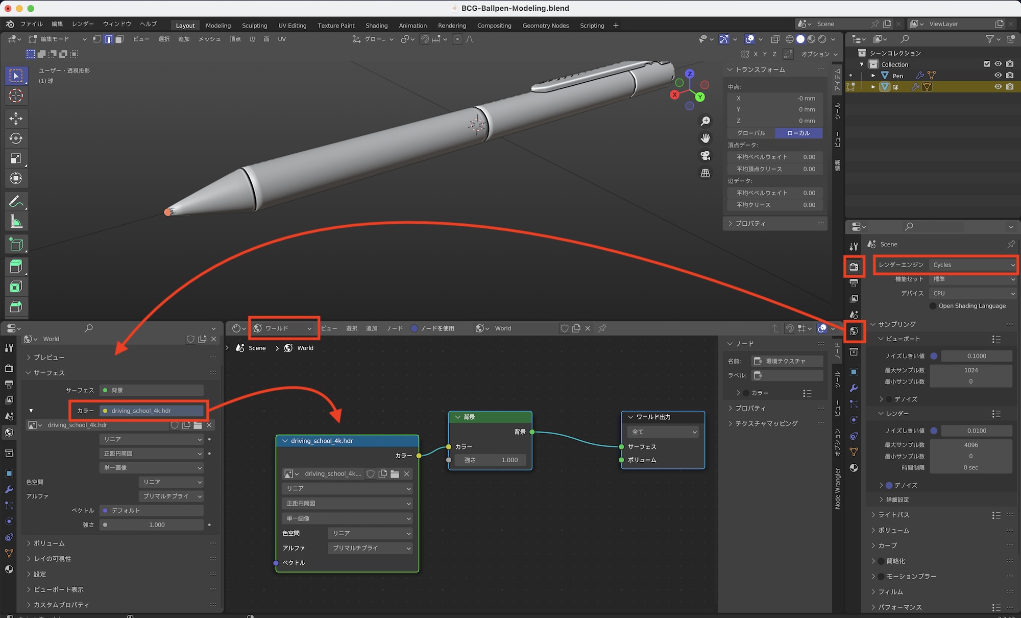 メッシュにマテリアルを適用する前に、簡単な照明を追加するためHDRIをワールドに反映させます。レンダープロパティを「Cycles」に変更し、ワールドプロパティの「カラー」を「環境テクスチャ」にして、シェーダーエディターからHDRIの画像を読み込みましょう。