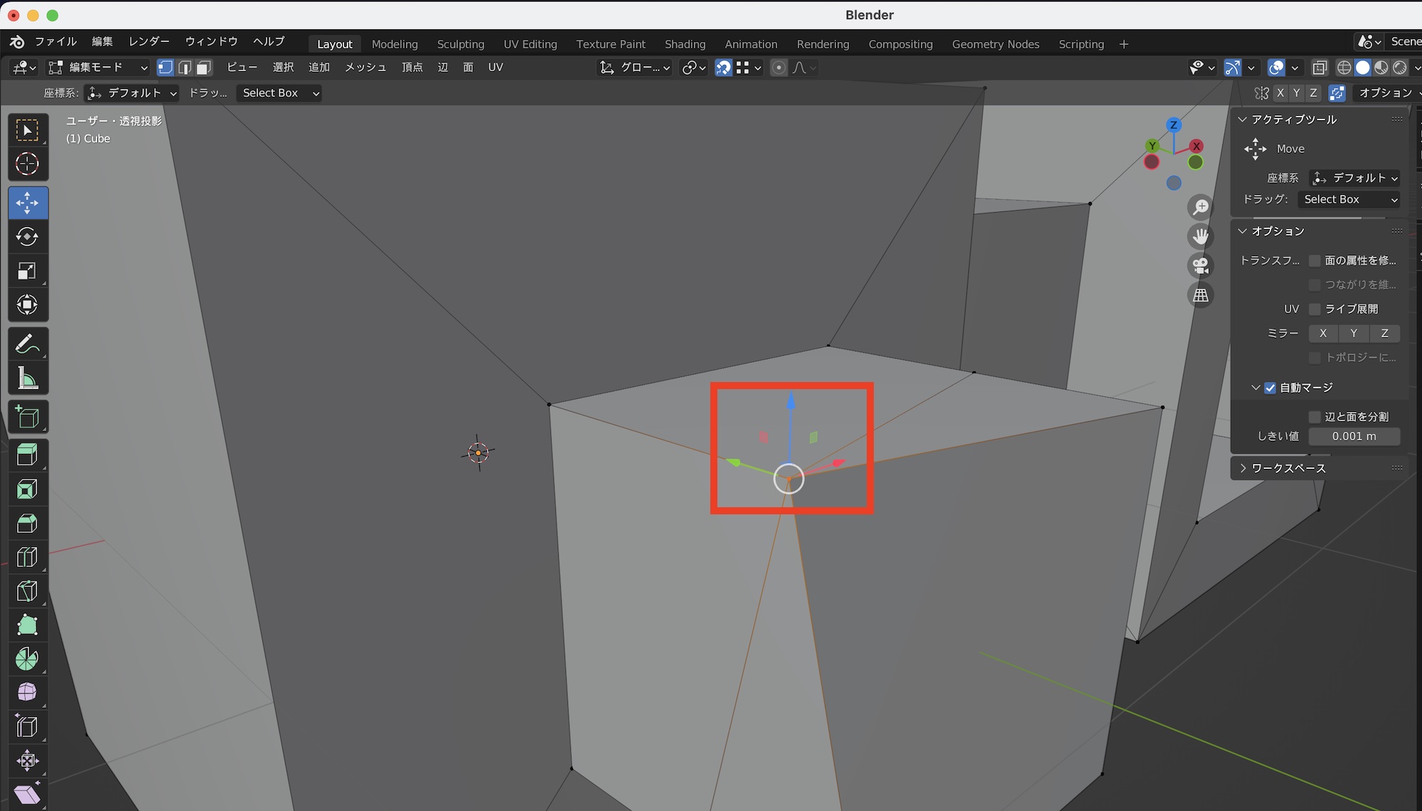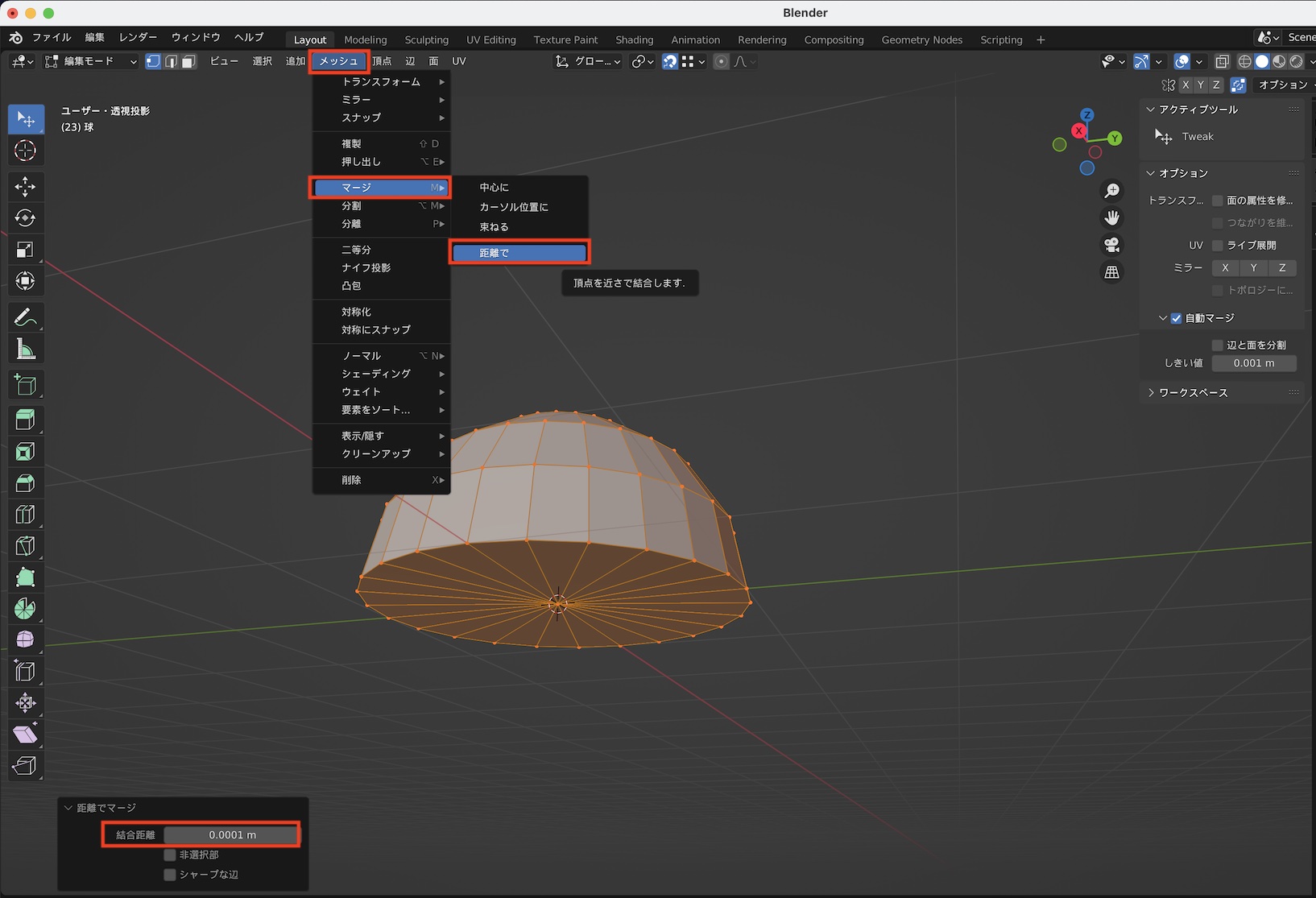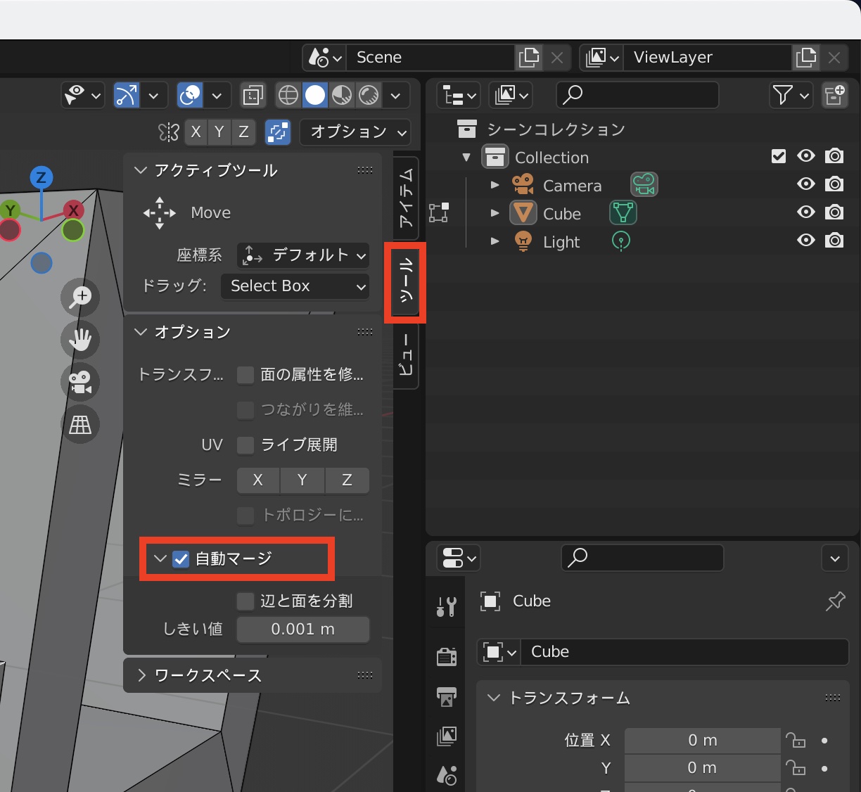 頂点または辺を結合させたい場合は自動マージのツールが便利です。まず、「N」キーまたは右側にある矢印アイコンをクリックして、「ツール」の項目にある「自動マージ」にチェックを入れます。