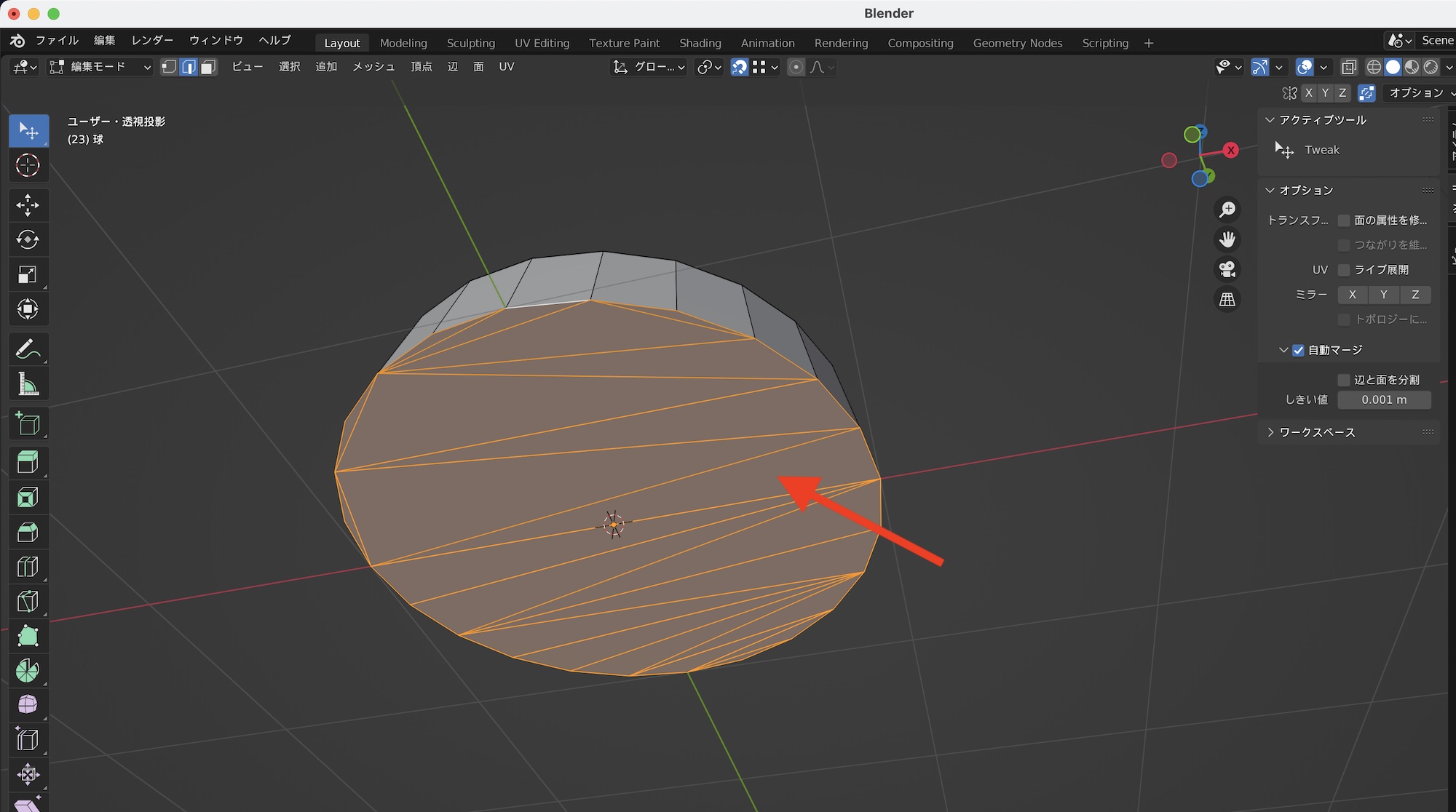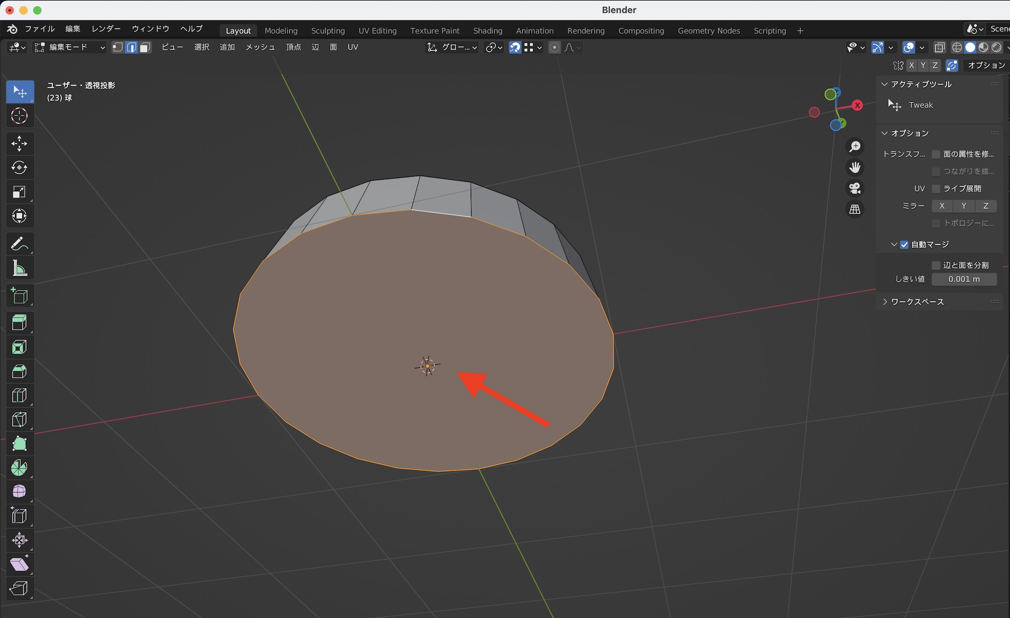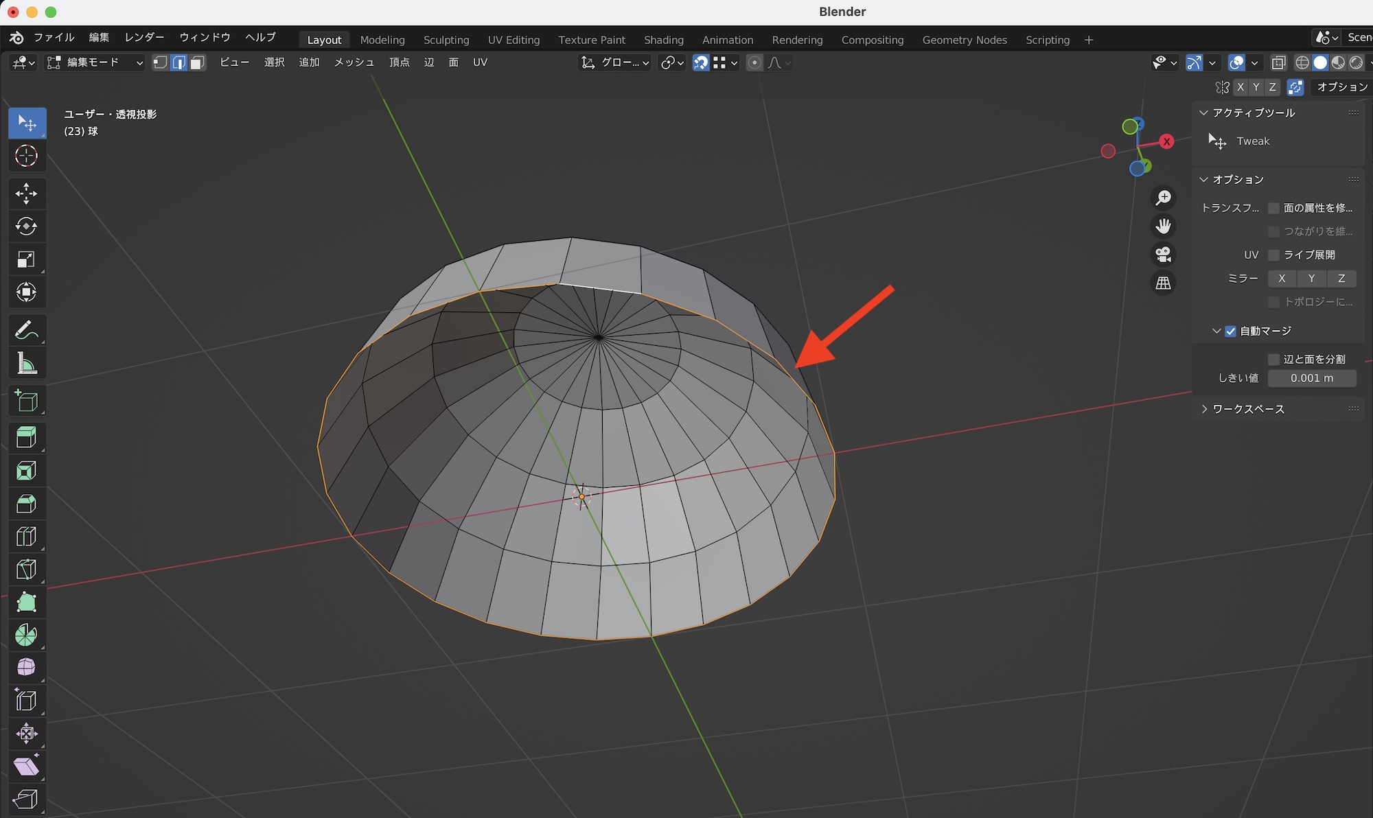 頂点または辺を結合させたい場合は自動マージのツールが便利です。まず、「N」キーまたは右側にある矢印アイコンをクリックして、「ツール」の項目にある「自動マージ」にチェックを入れます。