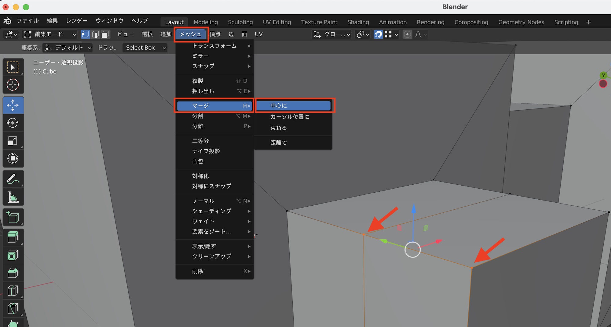 なお、自動マージではなく選択した頂点の中心に結合させたい場合は、頂点を選択した上で上部メニュー「メッシュ」、「マージ」の「中心に」を選択すると良いでしょう。このツールはショートカットキー「M」で呼び出すこともできます。