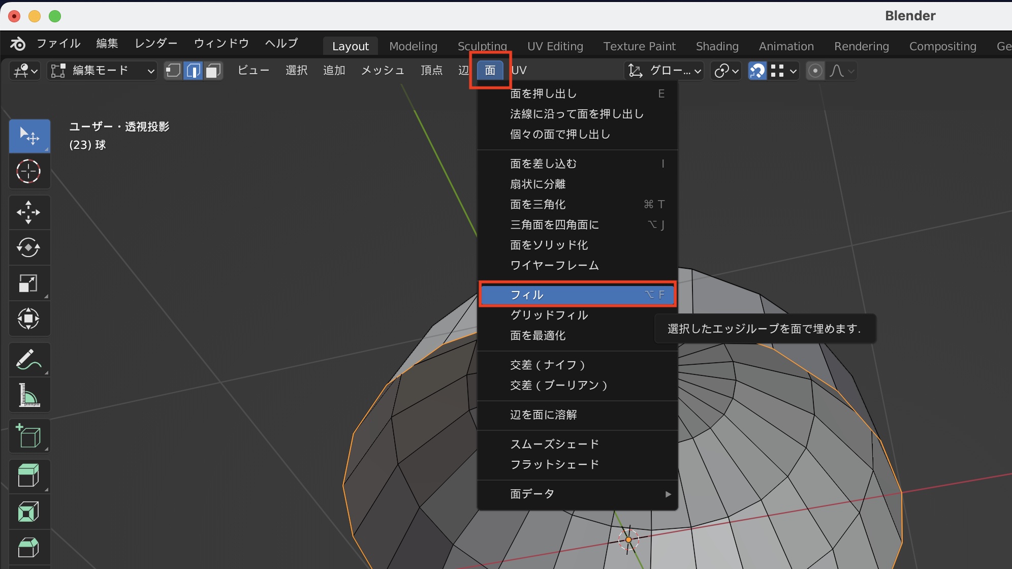 このフィルは上部メニューの「面」、「フィル」の項目からでも適用可能ですが、メッシュによってはショートカットキーを使った時とは違った結果が反映される場合があります。