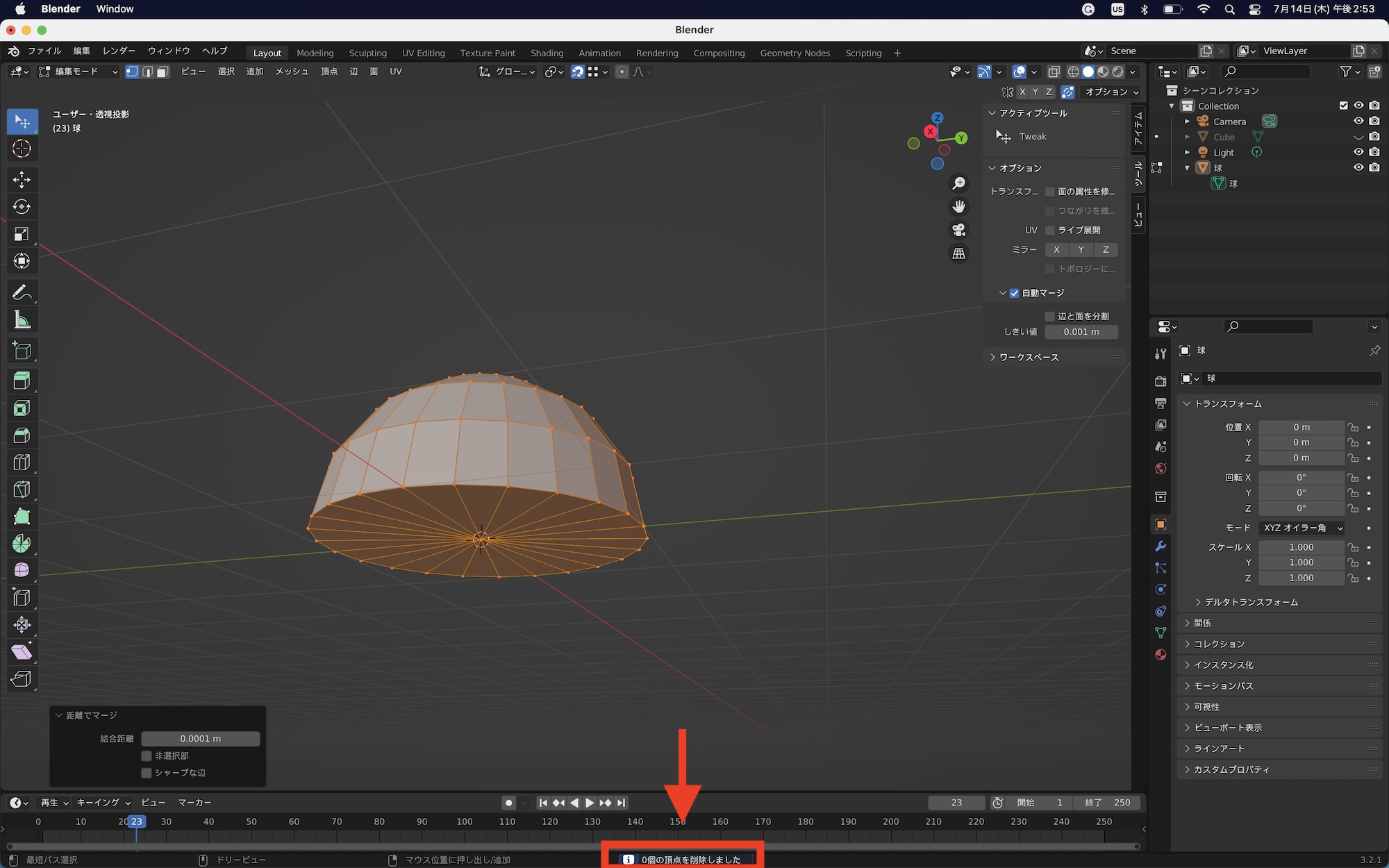 適用されると重なっていない隣接する頂点が結合され、きれいなメッシュに調整されます。削除された頂点がある場合は下の項目から確認することも出来ます。また、結合する頂点の距離は「結合距離」から調整できるので、必要に応じて変更すると良いでしょう。