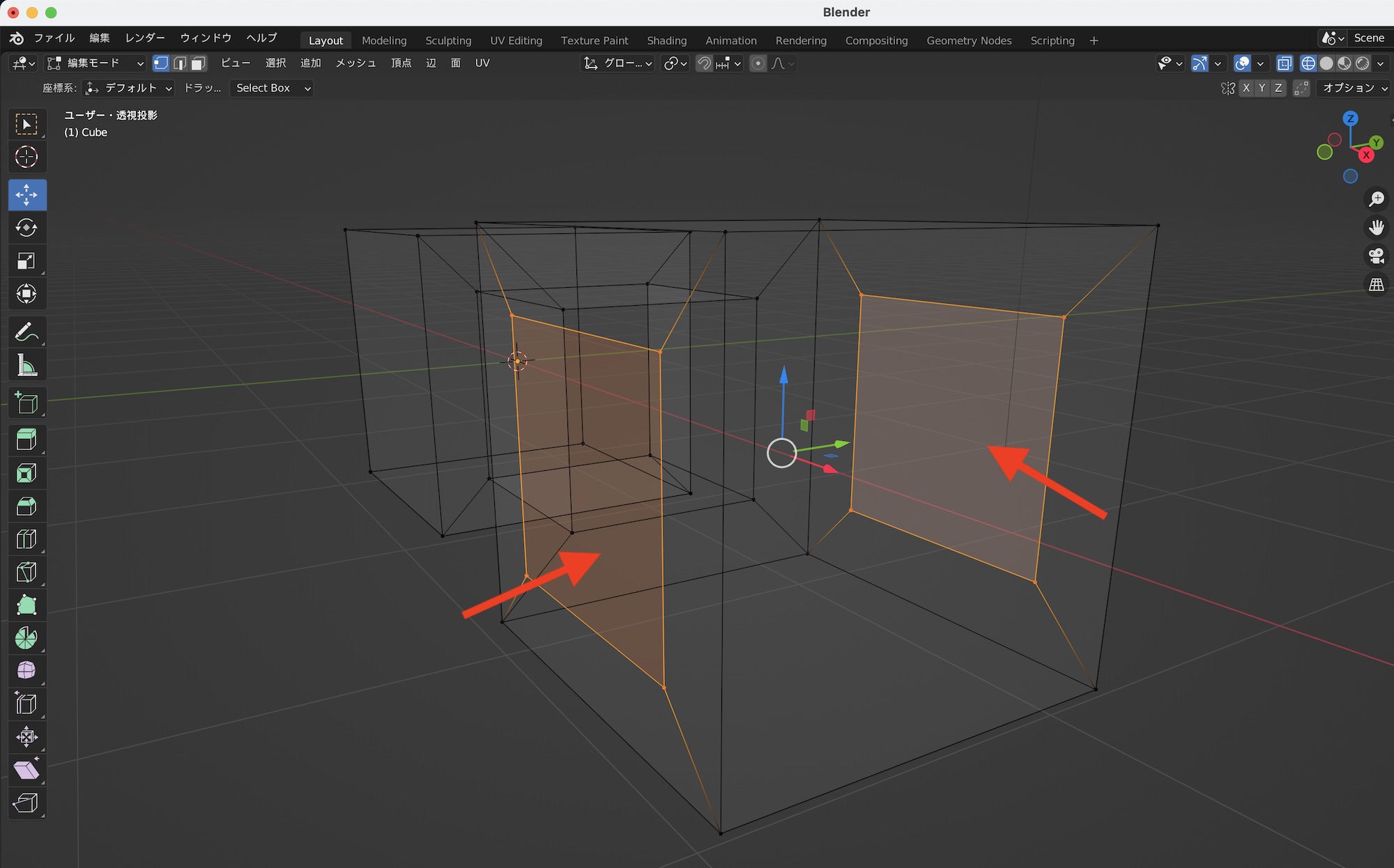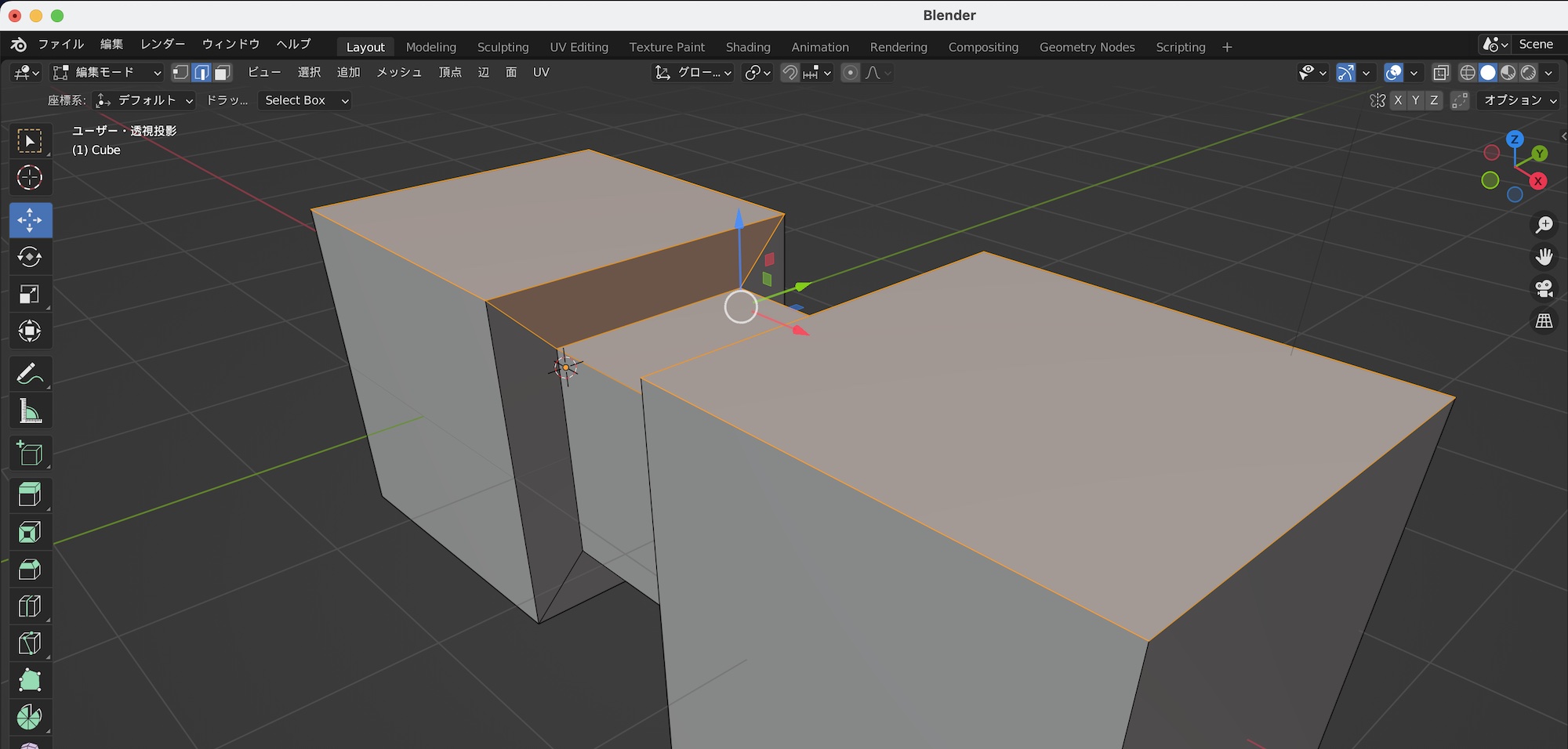 加えて、隣接する面を選択した状態で辺ループのブリッジを適用させると、重なっている面が削除され、オブジェクトが一体化させることも可能です。