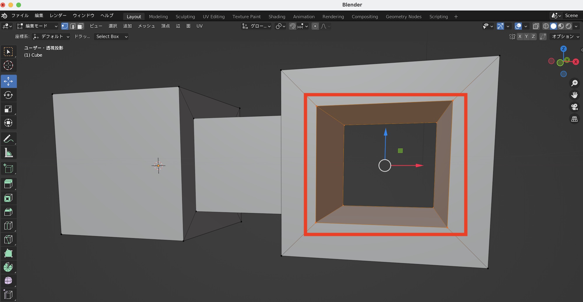 この辺ループのブリッジは面を埋めるだけではなく、下のように向かい合わせの面を選択した状態で適用すると穴を開けることも出来ます。