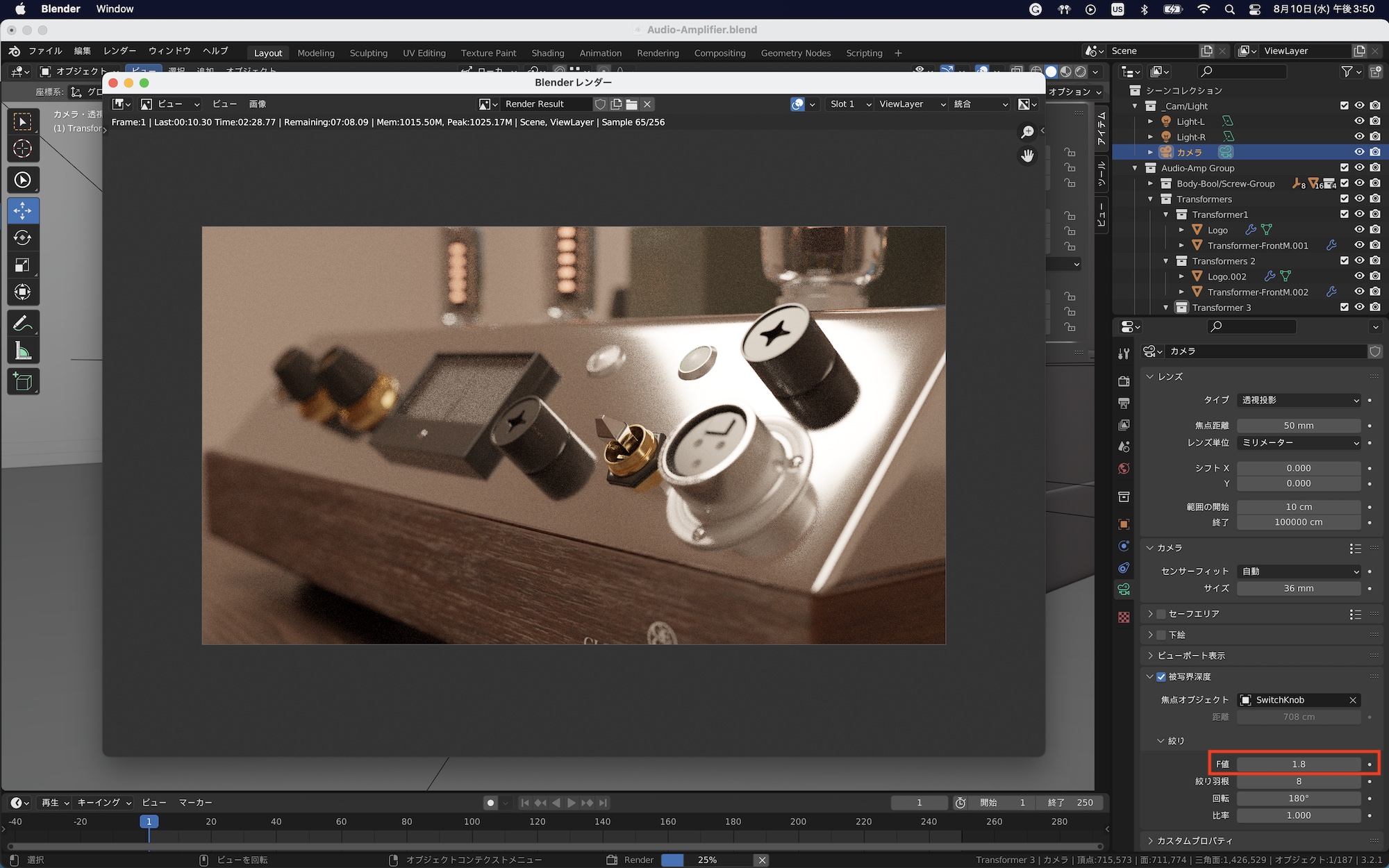 カメラを選択して、オブジェクトプロパティを開くと色々項目がありますが、基本的に「焦点距離」と「被写界深度」の調整で問題ありません。